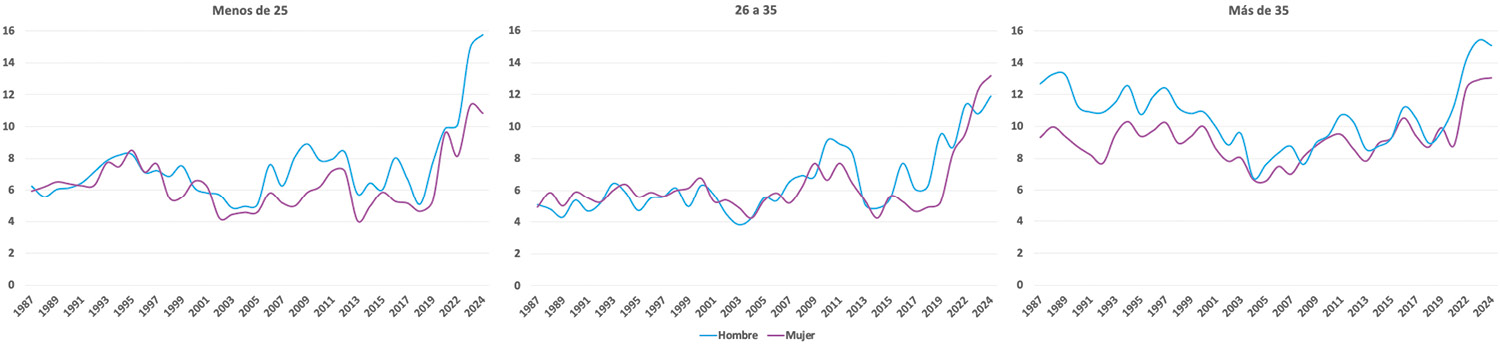 En el Gráfico 3 se muestra el porcentaje de personas que se ubica en las posiciones de derecha, por tramo de edad. Para ello han sido seleccionados los valores 8, 9 y 10 de la escala, con el objetivo de dejar fuera lo que se podría considerar centro-derecha (en este caso, las posiciones 6 y 7 de la escala)[4]. En el grupo de edad más joven (18 a 25 años) nos encontramos que son en mayor medida los hombres los que se ubican en estas posiciones. No obstante, los porcentajes tanto de hombres como de mujeres en la derecha radical han sido bajos hasta el año 2018. A partir de entonces se produce una subida en ambos géneros, aunque de nuevo son los hombres los que presentan una pendiente más pronunciada. A partir de 2022 las mujeres parecen estancarse y los hombres siguen acercándose progresivamente a la derecha, hasta que, en 2024, el porcentaje de hombres que se ubica en la derecha casi alcanza el 16%, mientras que entre las mujeres se encuentra 5 puntos por debajo, mostrando de nuevo una brecha de género que se ha ampliado en los últimos años.