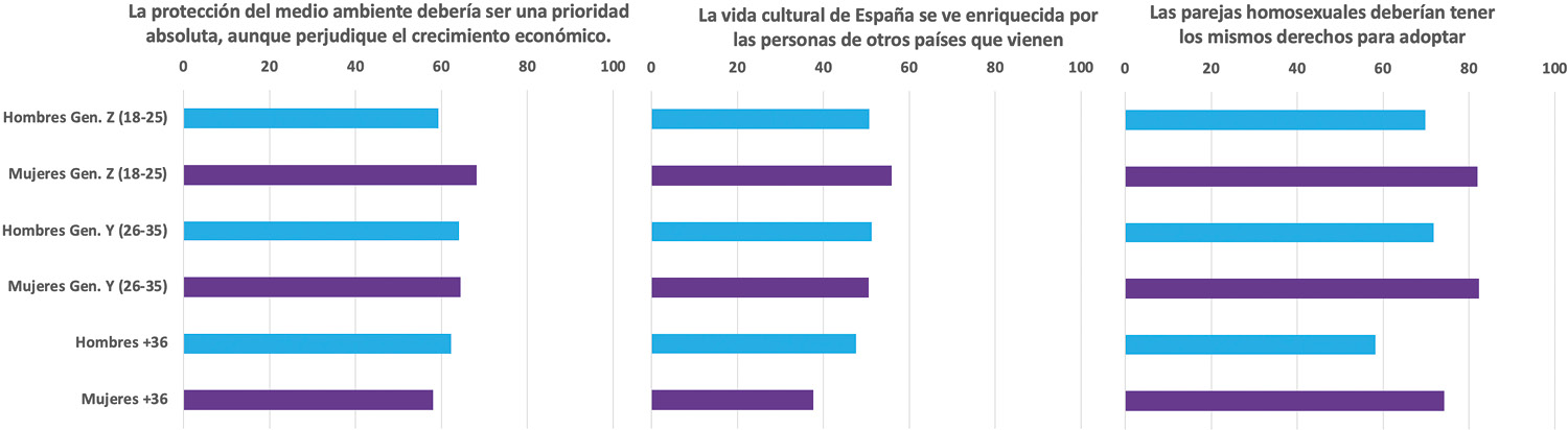 La perspectiva sostenida por los jóvenes Z españoles sobre la inmigración es más positiva que la de los adultos, lo cual podría atribuirse a su rol en la crianza en sociedades culturalmente diversas (Rinken, 2021). Concretamente, cuando se pregunta sobre si la vida cultural del país se enriquece con la presencia de inmigrantes, sólo existen diferencias significativas entre hombres y mujeres mayores de 35 años, siendo visibles algunas diferencias no significativas en la generación Z. Por último, sobre la evolución de las actitudes favorables hacia la diversidad sexual y de género, España se ha destacado por experimentar uno de los cambios más marcados de Europa, tendencia que se ha vivido desde los años ochenta hasta la Gran Recesión (Ramírez-Dueñas y Cordero, 2025). Sin embargo, una de las discrepancias más notables entre hombres y mujeres de todas las generaciones, incluida la Z, se encuentra precisamente en su actitud hacia los derechos de adopción de parejas homosexuales. En este caso, los hombres muestran una mayor resistencia en comparación con las mujeres, que muestran actitudes más inclusivas, evidenciando una clara distancia entre géneros independiente de la generación analizada.