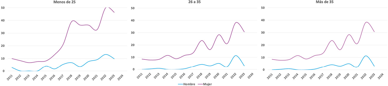 Porcentaje de personas que se consideran feministas por tramo de edad y género en España (2011-2023)