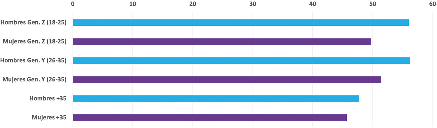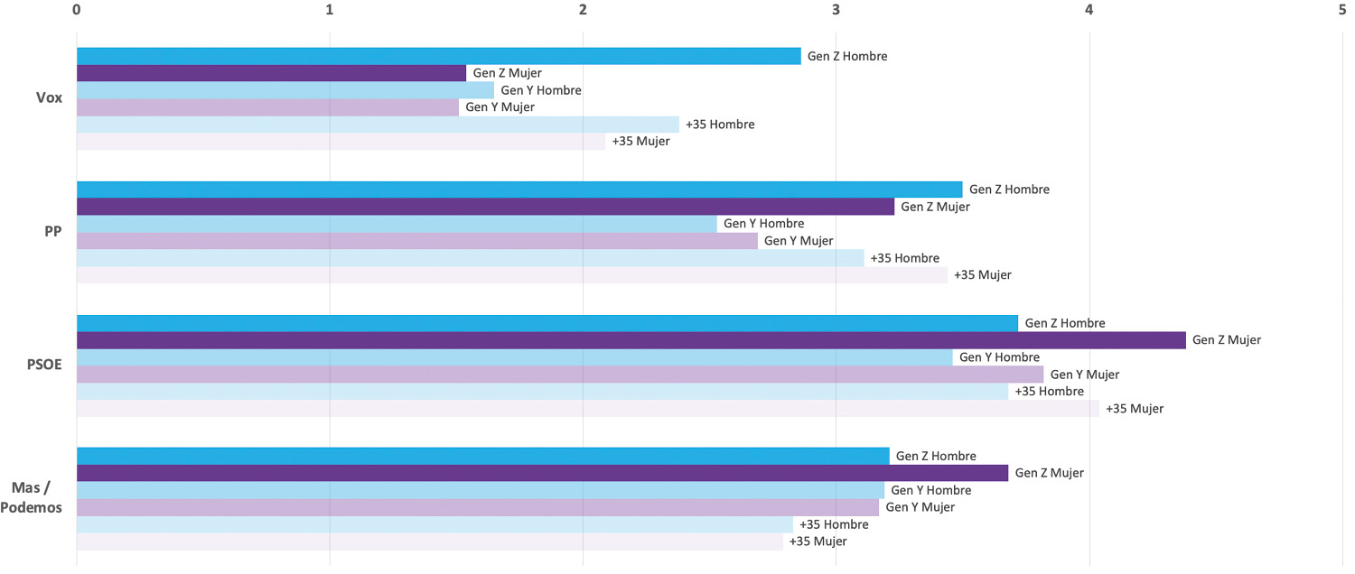 Son las dos generaciones más jóvenes, la llamada Generación Z (1997-2012) e Y (1981-1996), sobre las cuales parece emerger una brecha política e ideológica. Siendo una generación un grupo social —nacido dentro un determinado periodo— que comparte una serie de procesos históricos y culturales que configuran sus experiencias vitales (Mannheim, 1993/1928), estas dos generaciones han compartido vivencias culturales, sociales y políticas en el contexto español que han determinado su devenir, como la burbuja inmobiliaria, la crisis financiera o los años postcrisis. Sin embargo, más allá de las consecuencias económicas y vitales de estos ciclos económicos, varias cuestiones podrían haber sido esenciales para entender la mayor división en actitudes políticas e ideológicas de hombres y mujeres de ambas generaciones.