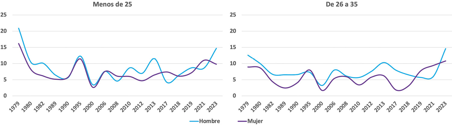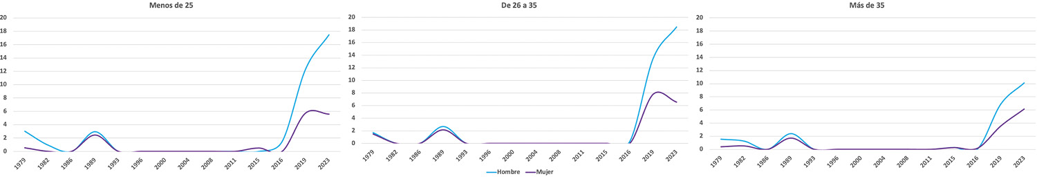 Como elemento adicional al partidismo, prestamos, por último, atención a la evolución del voto, ya que este sirve para reforzar la autoubicación ideológica, generando un proceso de retroalimentación que es especialmente importante en la formación de los valores políticos de los más jóvenes (Dinas, 2014)[6]. Concretamente, en el gráfico 10 se analiza el recuerdo de voto en elecciones generales a partidos de derecha radical y extrema derecha entre 1979 y 2023.[7] Durante el periodo analizado, las mujeres siempre han votado en menor medida a estas familias de partidos, aunque esta brecha de género entre los jóvenes se ha ido incrementando, especialmente entre los menores de 35 años. Lo primero que debemos destacar es que no encontramos diferencias de comportamiento en la tendencia entre los dos grupos de jóvenes (de 18 a 25 y de 26 a 35): ambos han registrado un aumento en su recuerdo de voto a los partidos de derecha radical y extrema derecha. No obstante, la magnitud de esta tendencia ha sido significativamente más pronunciada entre los hombres, rozando el 18% de apoyo electoral en las últimas elecciones generales, tres veces menos que entre las mujeres, entre las que no se alcanzan el 6%.
