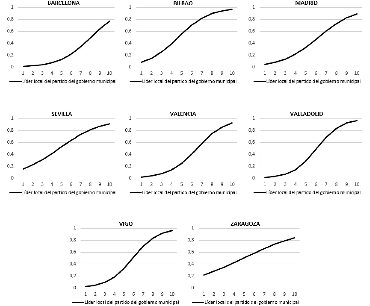 Una vez detallada la incidencia de todas las variables de los modelos en la variable dependiente de cada ciudad, se profundizará en la influencia de la principal variable independiente de interés para el presente estudio, la valoración del/de la líder local del partido del gobierno municipal. En este sentido, se precisa la magnitud de su efecto en todas las localidades examinadas mediante el cálculo de las probabilidades, tal y como observarse en el Gráfico 1. Manteniendo constante el resto de variables en sus categorías medias, al oscilar de la peor a la mejor valoración del/de la candidato/a municipal se incrementa la probabilidad de votar por su partido en 95,4 puntos porcentuales en Valladolid, en 94,1 puntos porcentuales en Vigo, en 90,4 puntos porcentuales en Valencia, en 88,7 puntos porcentuales en Bilbao, en 84,7 puntos porcentuales en Madrid, en 76,1 puntos porcentuales en Sevilla, en 75,8 puntos porcentuales en Barcelona y en 62,1 puntos porcentuales en Zaragoza.