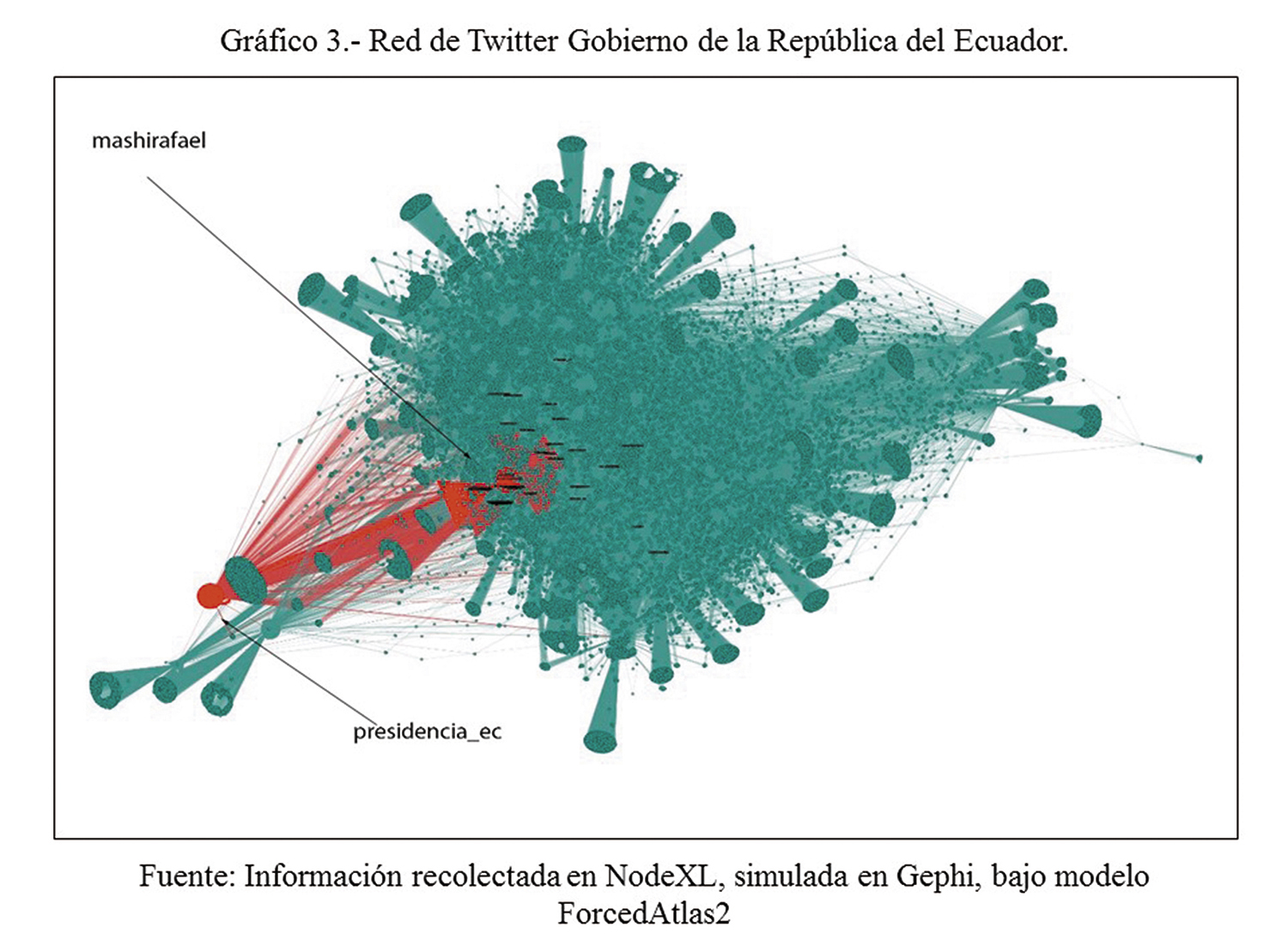 Los datos fueron tomados de las diferentes cuentas de los ministerios del ramo y sus ministros, relacionadas con la cuenta del presidente de la República (@mashirafael) y la de Casa Presidencial (@presidencia_ec), a través del software complementario NodeXL, que ejecuta una búsqueda y recolección automatizada de datos constantes en la red social (Hansen, Derek y Mark Smith. 2010. Analyzing social media networks with NodeXL: Insights from a connected world. Burlington, MA.: Morgan Kaufmann.Hansen y Smith, 2010: 46-47). Esto permite no solo conocer el comportamiento de los ministros y las organizaciones en torno a las cuentas de la Presidencia de la República, sino también la de los usuarios que interactuaron con ellos. Esto sirvió para comprender el tráfico realizado entre los actores y las interacciones disponibles entre los diferentes nodos.1. Los datos fueron tomados de las diferentes cuentas de los ministerios del ramo y sus ministros, relacionadas con la cuenta del presidente de la República (@mashirafael) y la de Casa Presidencial (@presidencia_ec), a través del software complementario NodeXL, que ejecuta una búsqueda y recolección automatizada de datos constantes en la red social (Hansen, Derek y Mark Smith. 2010. Analyzing social media networks with NodeXL: Insights from a connected world. Burlington, MA.: Morgan Kaufmann.Hansen y Smith, 2010: 46-47). Esto permite no solo conocer el comportamiento de los ministros y las organizaciones en torno a las cuentas de la Presidencia de la República, sino también la de los usuarios que interactuaron con ellos. Esto sirvió para comprender el tráfico realizado entre los actores y las interacciones disponibles entre los diferentes nodos.