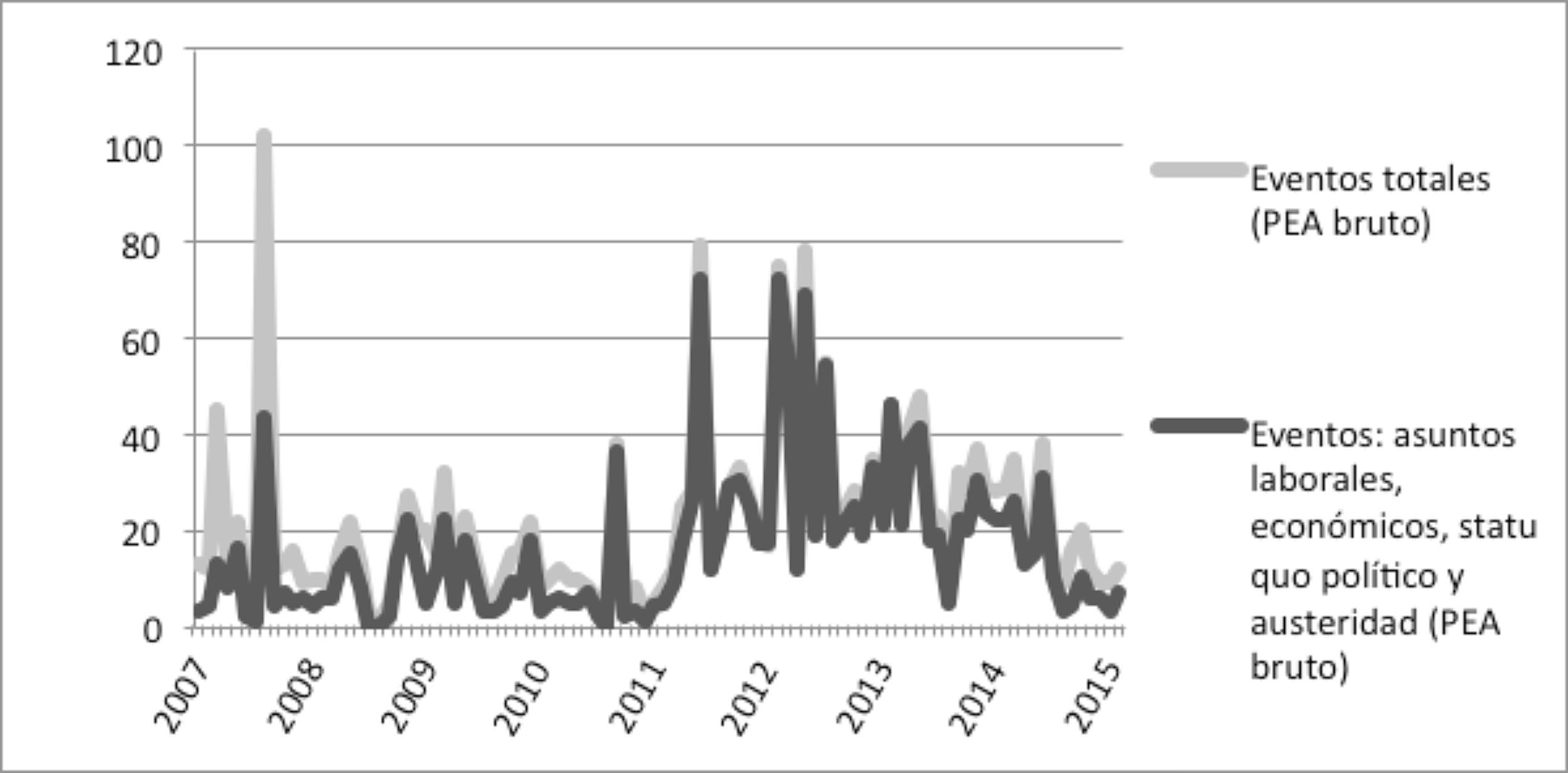 Para los dos gráficos, nivel de agregación: mensual. Y= número de eventos. X= tiempo (años, 2007-2015). Tono claro: todo tipo de eventos de protesta. Tono oscuro: solo eventos relacionados con el trabajo, asuntos económicos, statu quo político y austeridad.