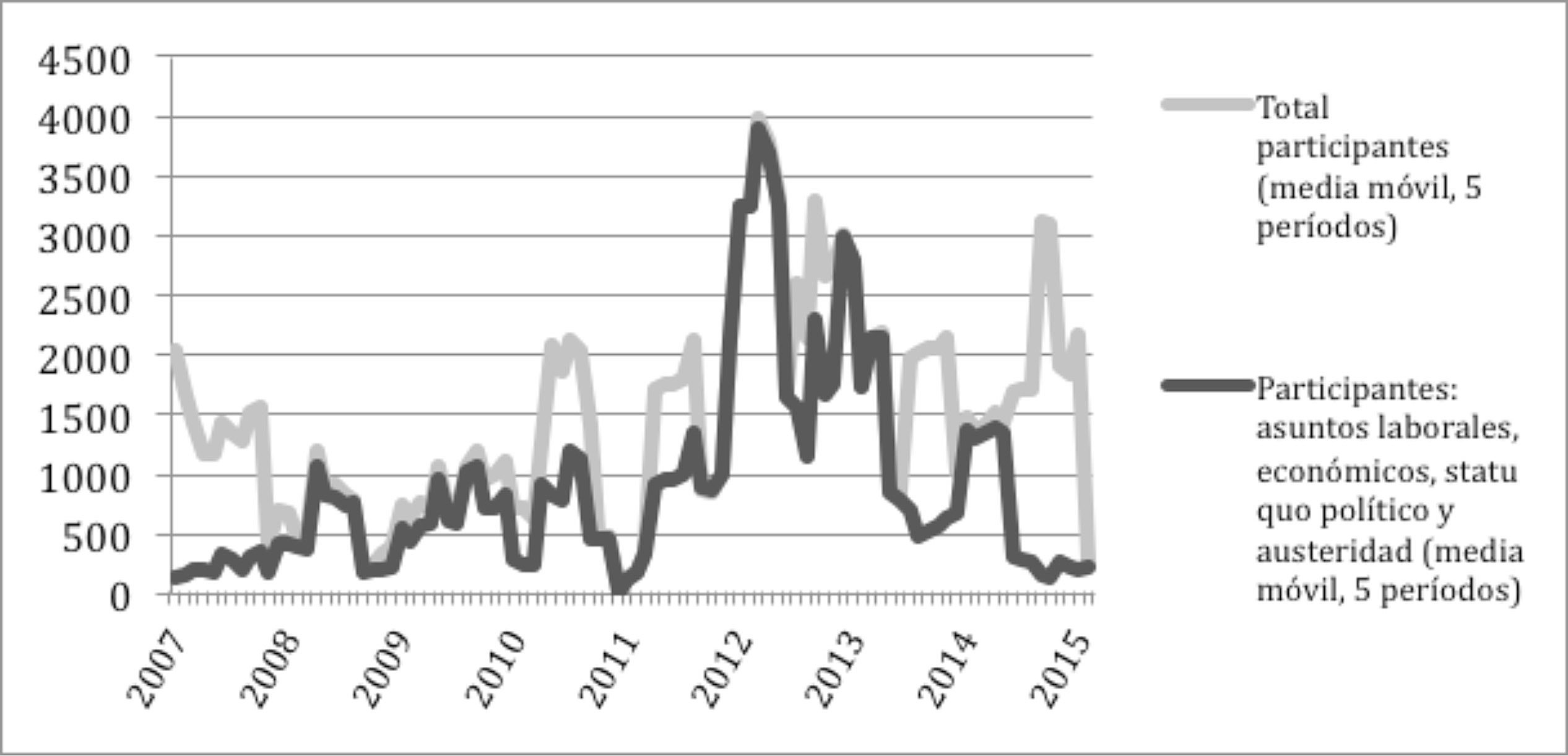 Nivel de agregación: mensual. Y= número definitivo –corregido– de participantes en eventos de protesta. X= tiempo (años, 2007-2015). Medias móviles, aplicando un suavizador a los datos brutos del PEA (5 períodos). Tono claro: total de participantes en todos los tipos de eventos de protesta. Tono oscuro: solo eventos relacionados con el trabajo, asuntos económicos, statu quo político y austeridad.