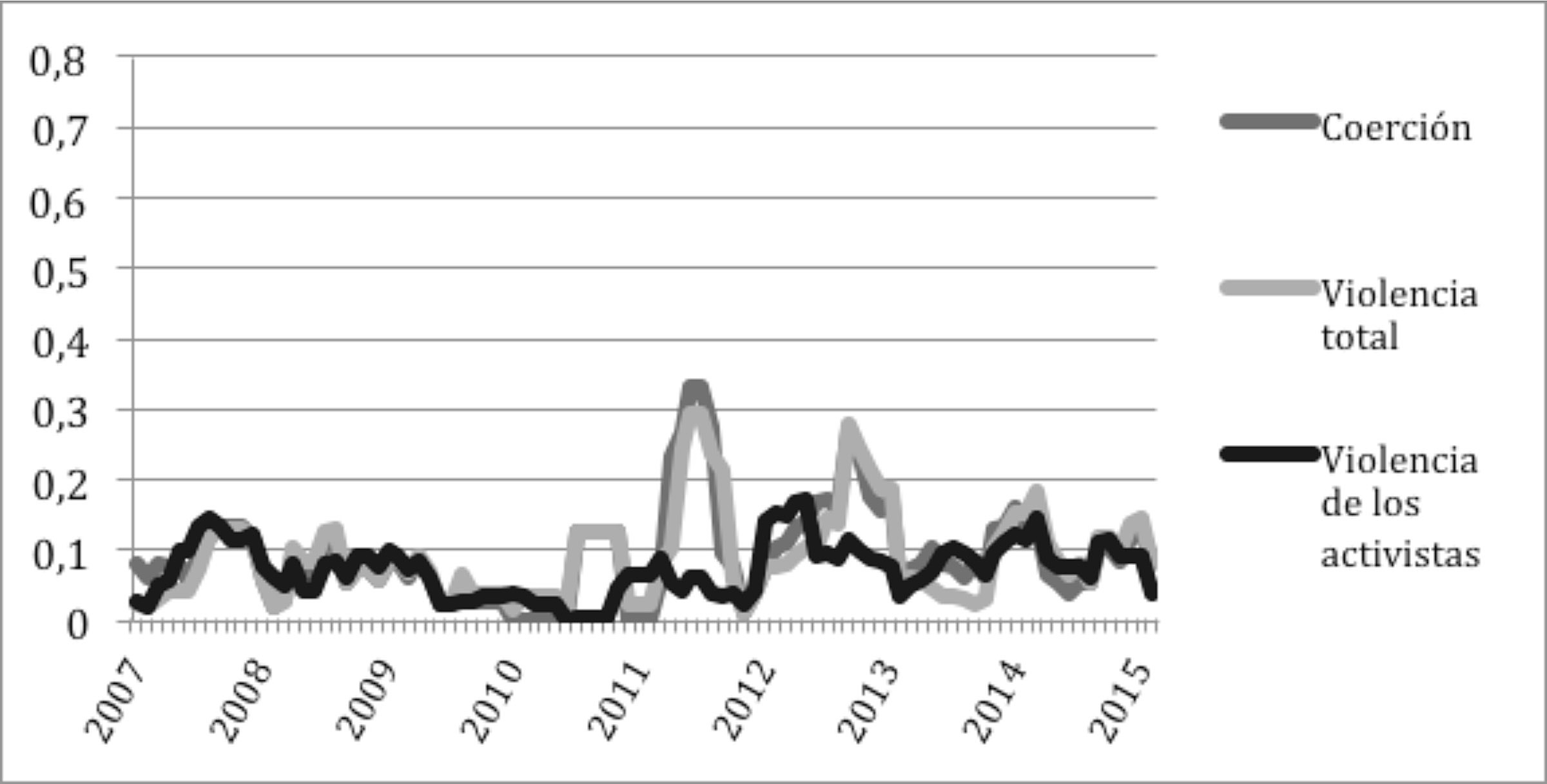 También podemos observar cómo la proporción de eventos contra la austeridad, la crisis, el statu quo político y asuntos laborales es alta con respecto al total del número de eventos –aproximadamente, dos tercios a lo largo del período de observación–. Esta proporción es especialmente elevada durante el clímax de las protestas, cuando se corresponden casi con el 90 de los eventos totales. En la fase inicial del ciclo, esta proporción es notablemente inferior.
