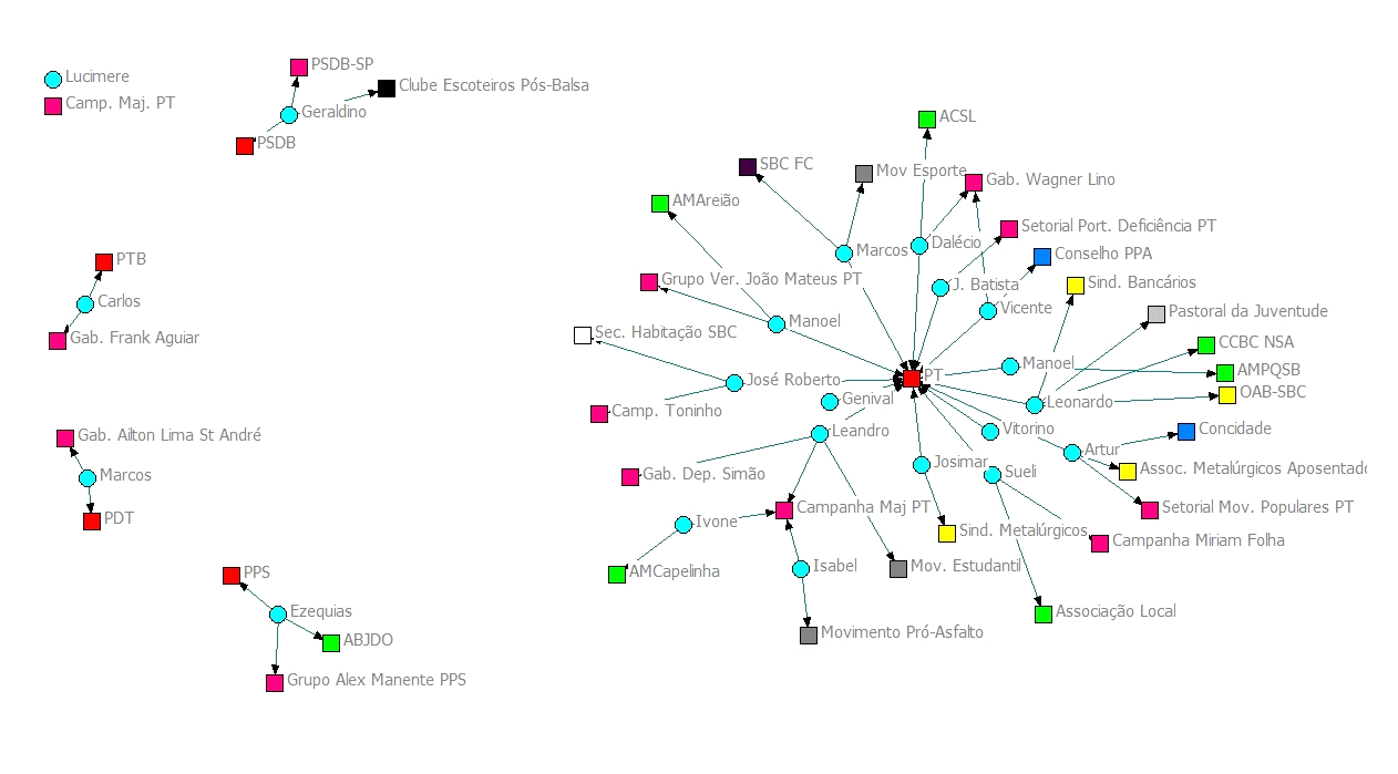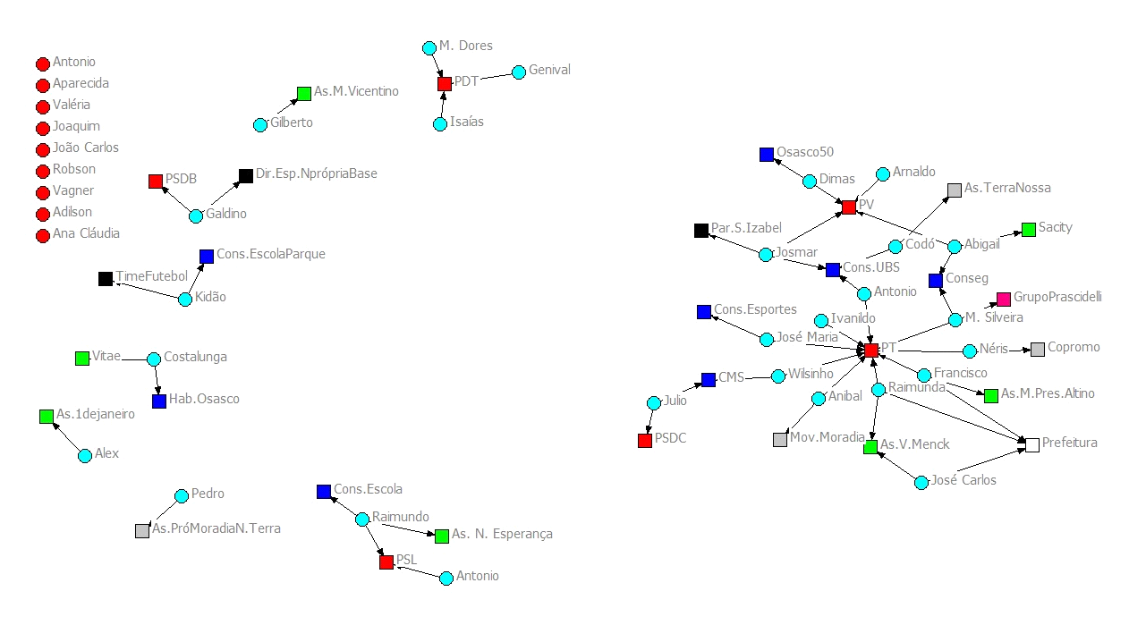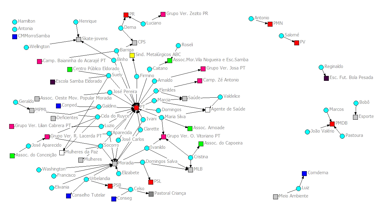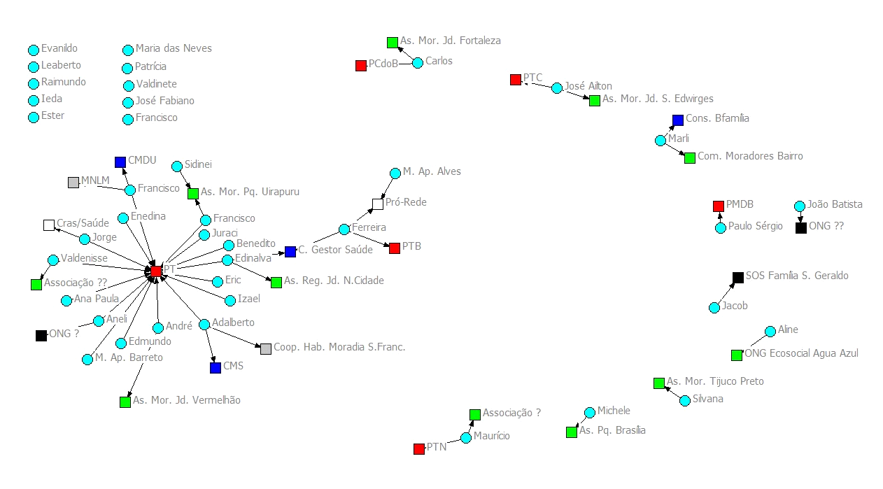 Sin embargo, también se observan muchos vínculos con los consejeros de las asociaciones de vecinos (7), grupos sindicales (4) y movimientos sociales (4), sobre todo entre los vinculados al PT. No se puede decir lo mismo de los otros cuatro consejeros afiliados a otros partidos políticos, excepto el consejero del PPS.