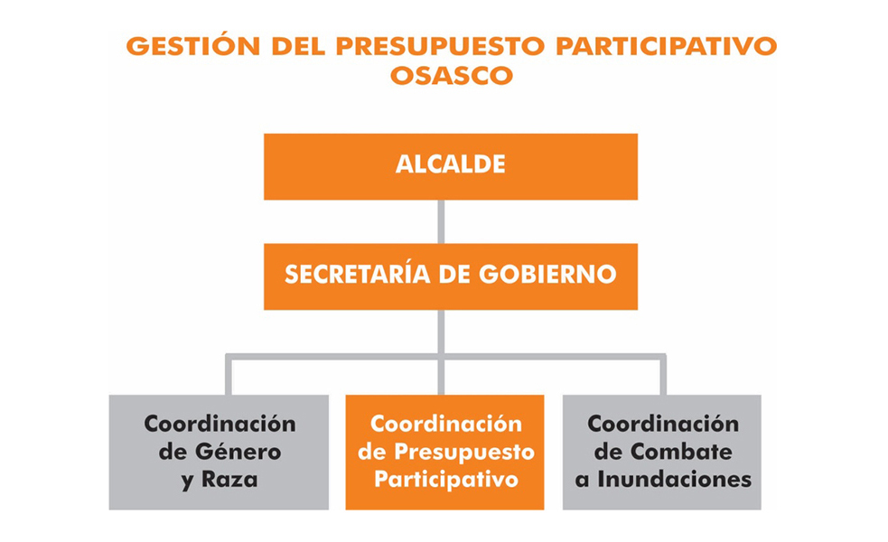 El paso a un modelo mixto a caballo entre la democracia de proximidad y el neocorporativismo se refuerza por la ubicación de la Coordinación de Presupuesto Participativo en la estructura de gobierno, conectada a la Coordinación de Participación Popular, que a su vez formaba parte del gabinete del alcalde, que también albergaba a las siguientes coordinadoras: Políticas para las Mujeres, Políticas de Juventud para la Promoción de la Igualdad Racial y de los Consejos.