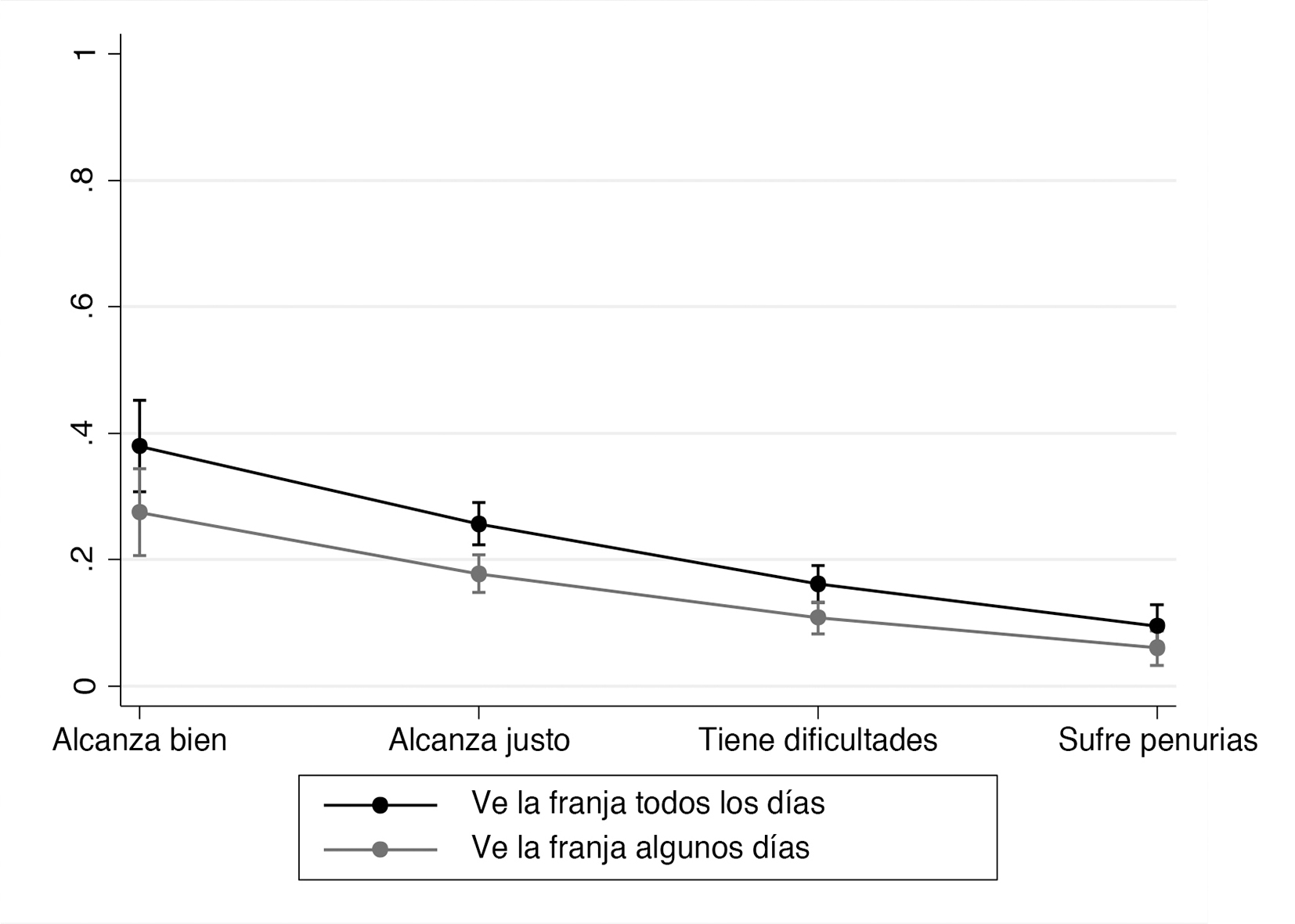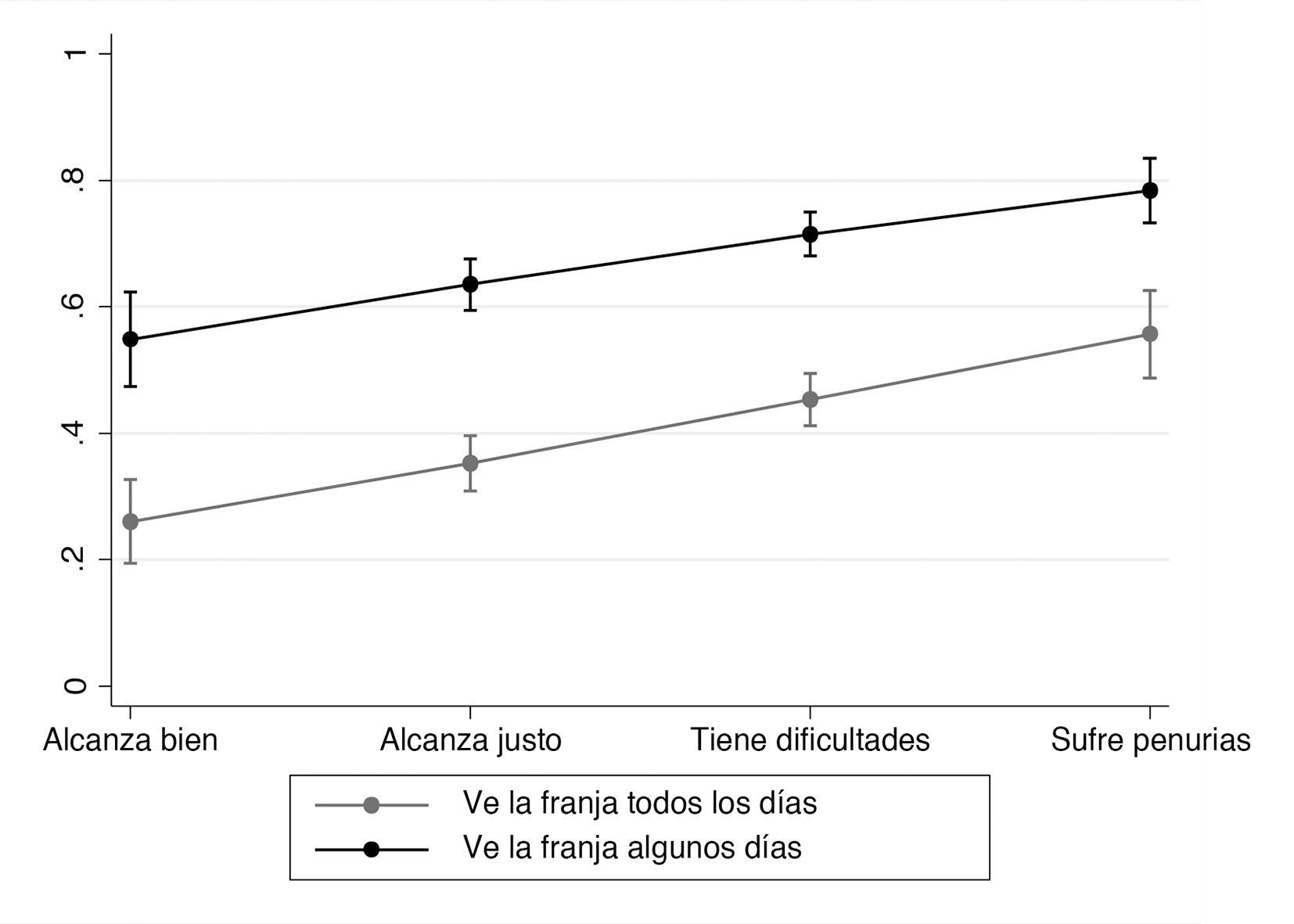 Ingreso subjetivo, cuyas categorías son «le alcanza bien», «le alcanza justo», «tiene dificultades», «tiene dificultades, sufre penurias».