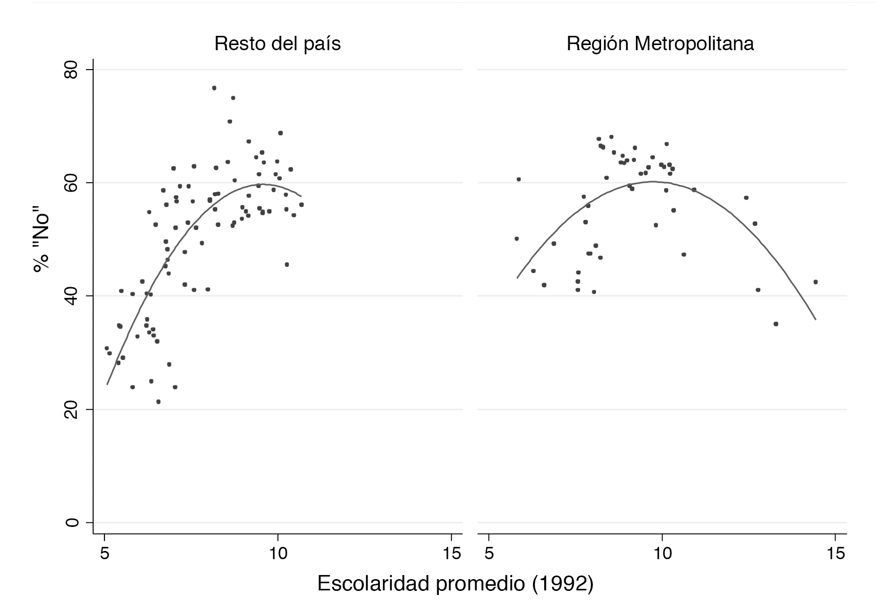 Relación entre escolaridad promedio y votación del «no» según zona geográfica