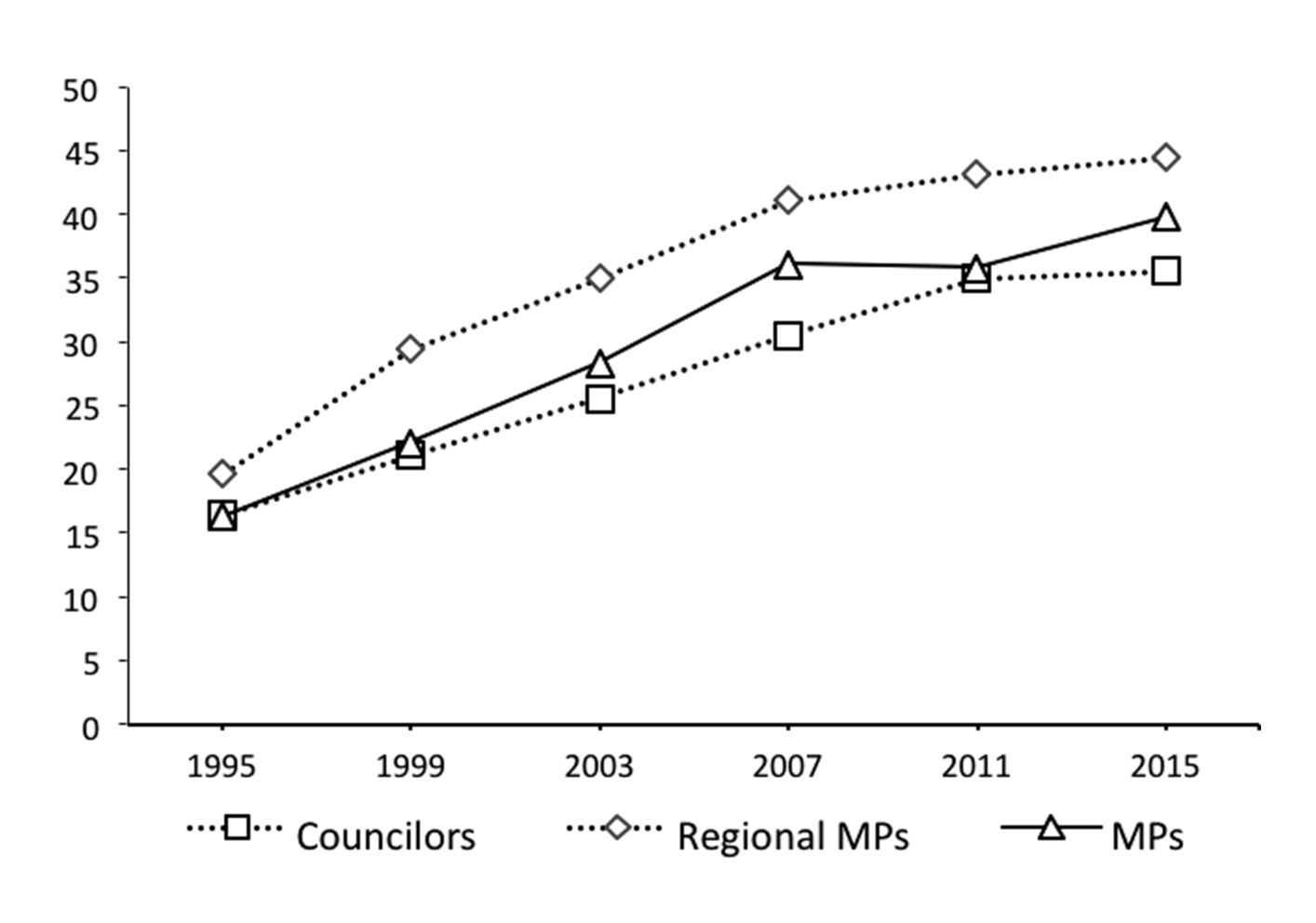 Spain constitutes a positive example of the gradual inclusion of women in the political sphere. Over the past two decades, their proportion in legislatures has increased from less than 20 % across the board in the mid-90s to current figures of 40 % in the national lower chamber, 45 % in regional parliaments and 36 % in local assemblies (see figure 1). It is remarkable how rapid and homogeneous the inclusion of women —particularly in regional parliaments— has been ( Verge, Tània, Maria A. Novo, Isabel, Diz and Marta I. Lois. 2016. “Género y Parlamento: impacto de la presencia política de las mujeres”, in Xavier Coller, Antonio Jaime and Fabiola Mota, (eds.), El poder político en España: parlamentarios y ciudadanía Madrid: Centro de Investigaciones Sociológicas.Verge et al., 2016). By contrast and interestingly, rates are lower at the local level. This is a common pattern not only in Spain but throughout Europe in general ( Sundström, Aksel. 2013. Women’s Political Representation within 30 European Countries. QoG Working Paper Series, 2013 (18).Sundstrom, 2013), despite the intuitive perception that women should have greater access to local elected office where supply barriers such as time devoted to political activity or geographical distance are lower. However, few studies have addressed the topic of women in local politics ( Navarro, Carmen and Lluis Medir. 2016. “Patterns of Gender Representation in Councils at the Second Tier of Local Government. Assessing the Gender Gap in an Unexplored Institutional Setting”, in Xavier Bertrana, Björn Egner and Hubert Heinelt (eds.), Policy Making at the Second Tier of Local Government. What Is Happening in Provinces, Counties, Départements and Landkreise in the On-going Re-scaling of Statehood. Abingdon, Oxon : Routledge.Navarro and Medir, 2016).