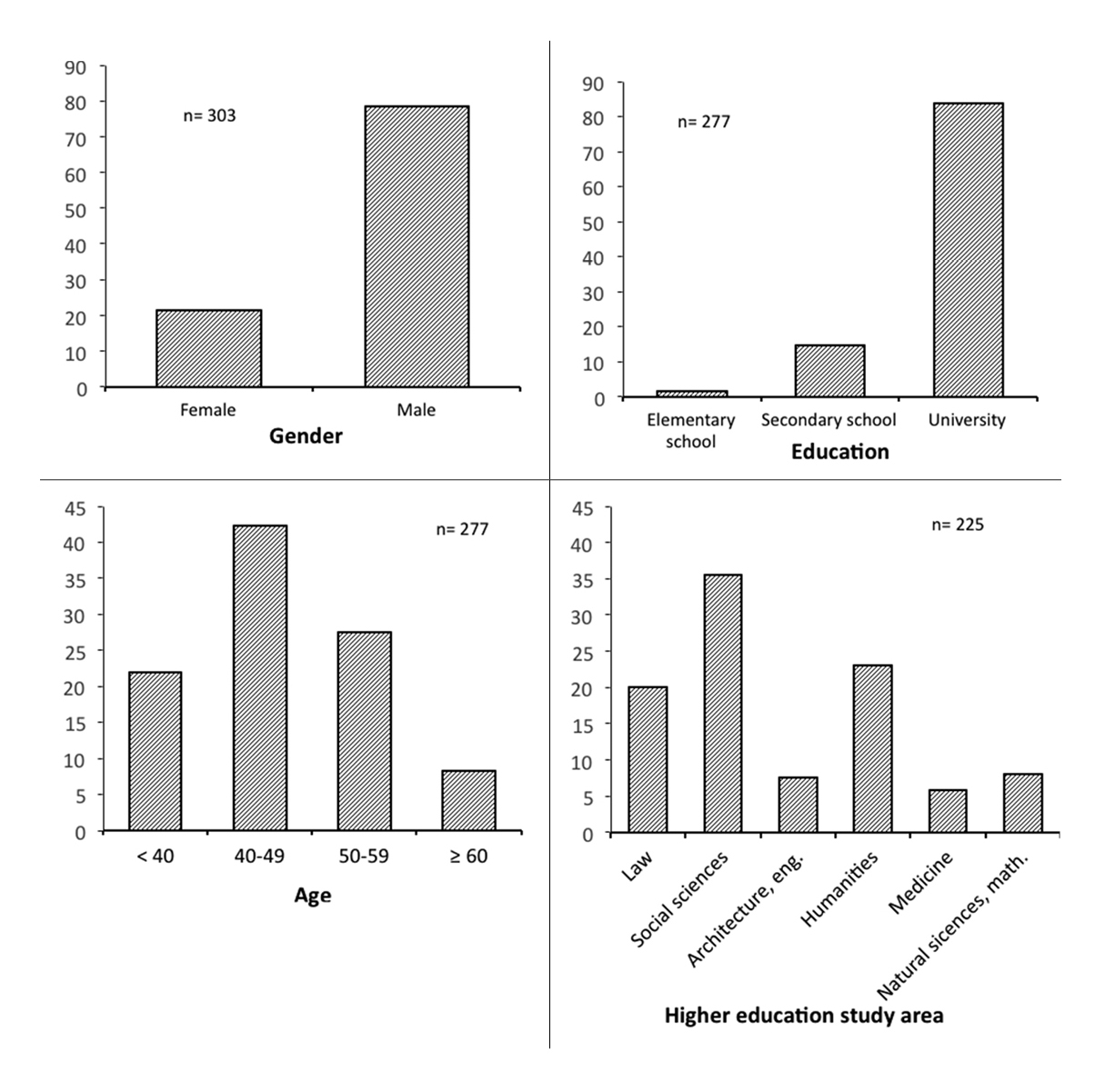 Regarding the socio-demographic profile of the Spanish mayors, our results tend to confirm previous findings on the topic with some singularities. In figure 2, we report mayors’ gender, age, level of education and area of university studies. In a nutshell, a clear majority are men (79 %), in their middle age (46 years old on average) and with a university degree (84 %) obtained mainly in the areas of social sciences (35 %) and humanities (23 %).