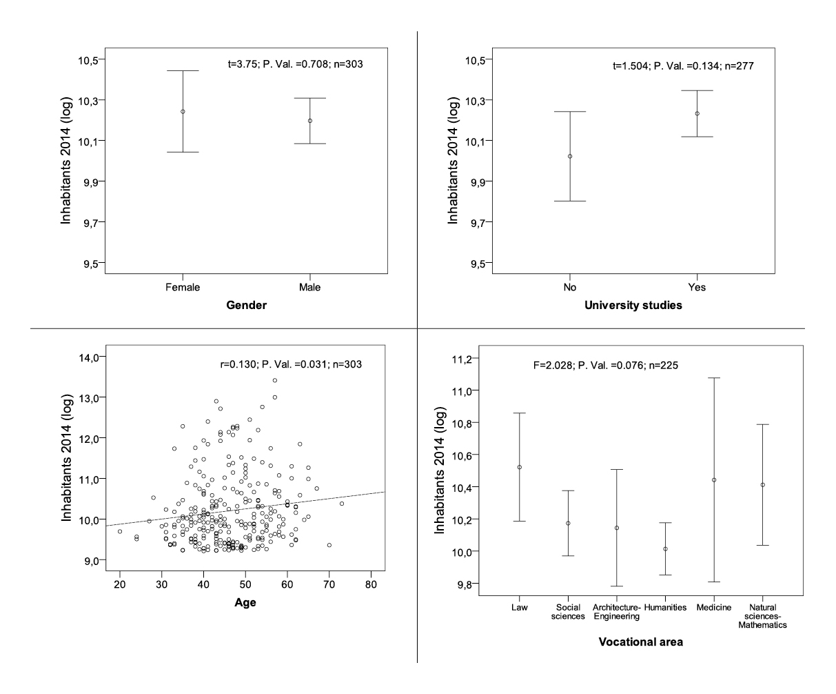 Regarding the expectation of differences in mayors’ social profile by population size, figure 3 presents the results. First, contrary to other studies that pointed to big cities being more diverse and, therefore, more open spaces for women to compete, our data do not confirm this direction. In this respect, the fact that the biggest cities in the country are nowadays governed by women (Manuela Carmena in Madrid and Ada Colau in Barcelona) can not be taken as a pattern. But, according to our data, big cities are not more hostile environments either. The number of inhabitants is unrelated to the likelihood of finding more individuals of a specific gender in the mayoral office. Second, the same disconnection applies for education. Although better trained mayors tend to lead larger communities, differences are not statistically significant.