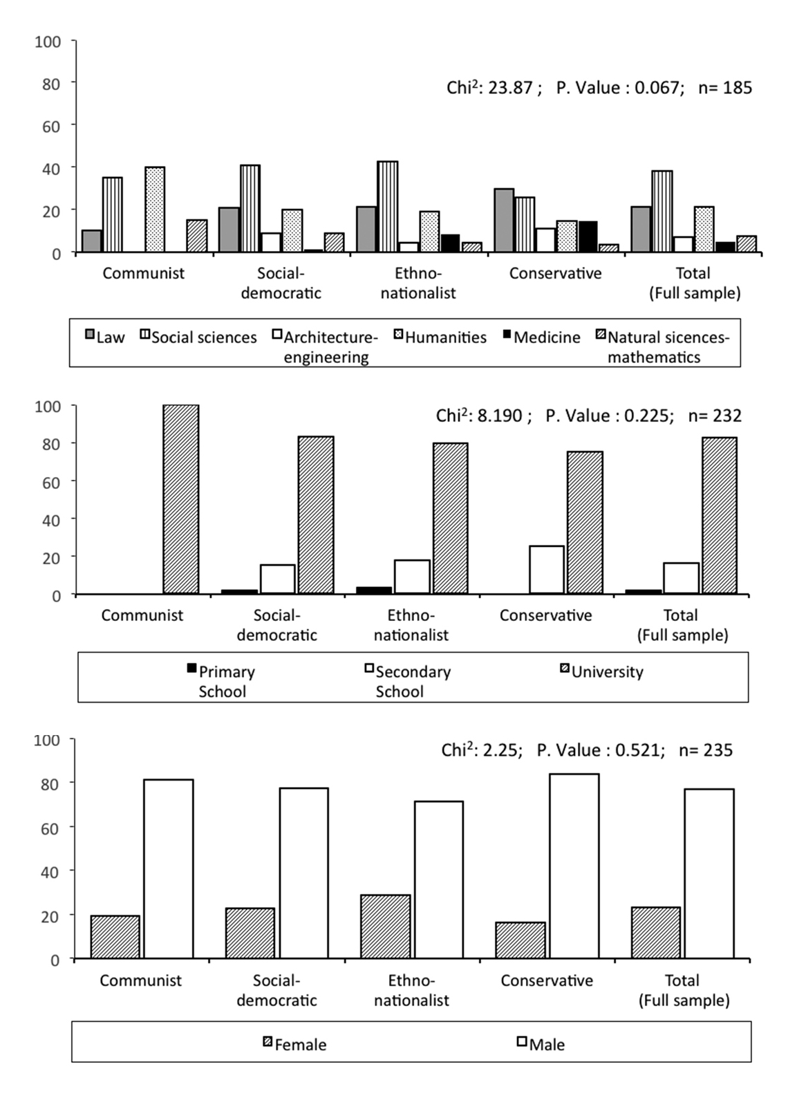 Depending on the metrics of the variables involved, the bivariate analyses consisted in crosstabs (with Chi2 tests), mean comparisons (with t or F tests) and Pearson correlation’s (with t tests). In the case of the multivariate analyses of the political ambitions, given the qualitative nature of the dependent variable we employed logistic regression.