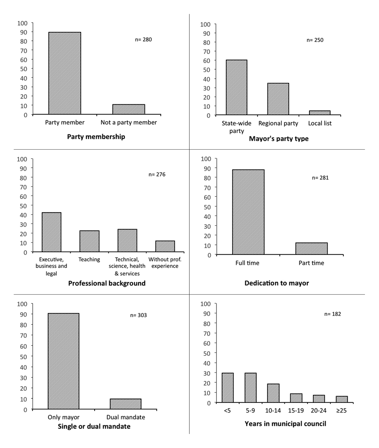 Professionals would tend to be full-time mayors with long-established political experience either in the mayoral office or in the council. They are more likely to be members of local branches of regional or national political parties, and their previous professional experience is frequently connected to the party organization. Where the political system allows it, they would tend to hold other mandates simultaneously in provincial, regional or national assemblies or institutions. In terms of political ambitions, their intentions, once the current electoral period is over, would be to either run again at the next election for the same office (static ambitions) or to seek upward mobility to a higher political office (progressive ambitions). Given the described emergence of professionalization patterns of local political elites in executive positions, we expect, for our sample, to find a predominance of the professional profile.