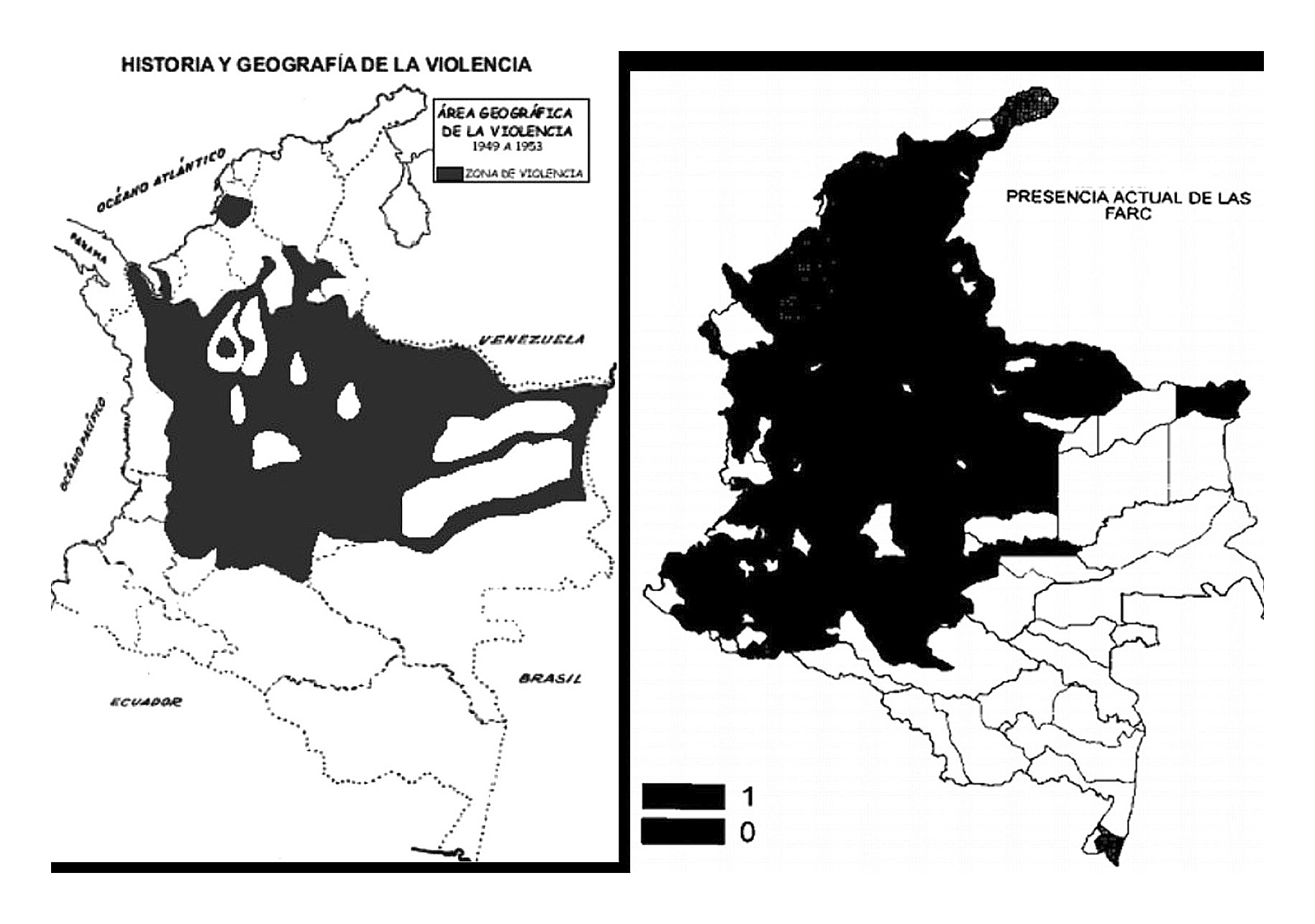 En lo que respecta a Colombia, varios trabajos se han servido de la geografía para atender y entender las evoluciones del conflicto armado. El primer intento por representar en un mapa lo que resultaba la magnitud de la violencia[4] lo plantean Fals Borda et al., (Fals Borda, Orlando, Germán Guzmán y Eduardo Umaña. 1962. La violencia en Colombia. Bogotá: Tercer Mundo.1962), si bien de una manera muy rudimentaria, no solo por cuestiones tecnológicas, sino por la misma comprensión de violencia, entendida como cualquier acción que gravase la vida humana en dicho contexto de violencia. Hay que esperar tres décadas para encontrar un trabajo que, nuevamente, recupere la necesidad de presentar en mapas las configuraciones espaciales de la violencia en Colombia. Reyes (Reyes, Alejandro. 1993. Geografía de la violencia en Colombia. Informe de investigación. Bogotá: IEPRI.1993), en Geografía de la Guerra, representa la violencia guerrillera de las FARC, si bien con una intención poco alejada de la anterior, al mostrar en un mapa los municipios que, al menos, habían tenido una acción guerrillera en los últimos años, lo cual arroja como resultado un mapa casi en su totalidad monocolor negro. Igualmente, Vélez (Vélez, María. 2001. «FARC-ELN: evolución y expansión territorial», Desarrollo y Sociedad, 47: 151-225.2001) novedosamente busca comparar marcos temporales distintos, presentando cuál era la presencia guerrillera en 1980 y dos décadas después, aunque al trabajar sobre categorías 1-0 tampoco termina dando cuenta de la magnitud y la intensidad real del activismo guerrillero.