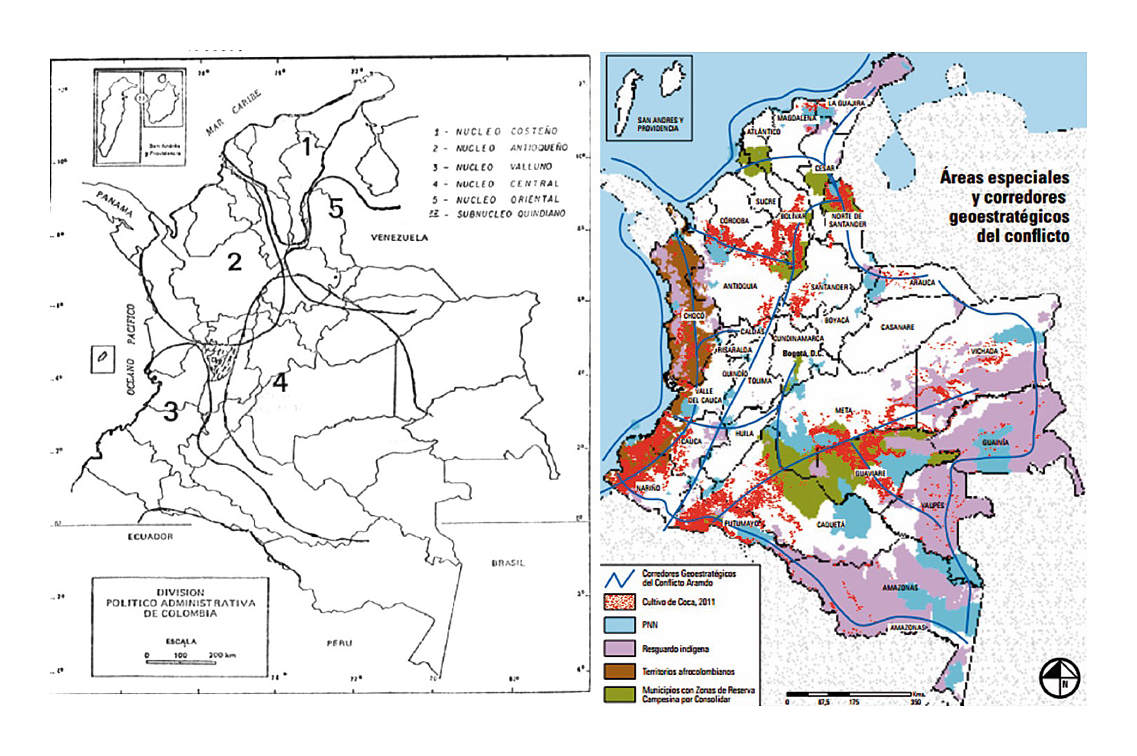 Empero, igualmente conviene precisar que la costa atlántica, a su vez, respondía a unas particularidades específicas, en tanto que se trataba de un escenario con menor pie de fuerza y arraigo histórico por parte de las guerrillas, sin terreno selvático, montañoso y fronterizo que favoreciese sus lógicas de presencia y combate, y con una escasa presencia de cultivos ilícitos, fundamentales en las finanzas de los grupos guerrilleros. Estos son cuatro elementos que, sensu contrario, son característicos del noreste y el suroeste, objeto de estudio de las siguientes páginas.