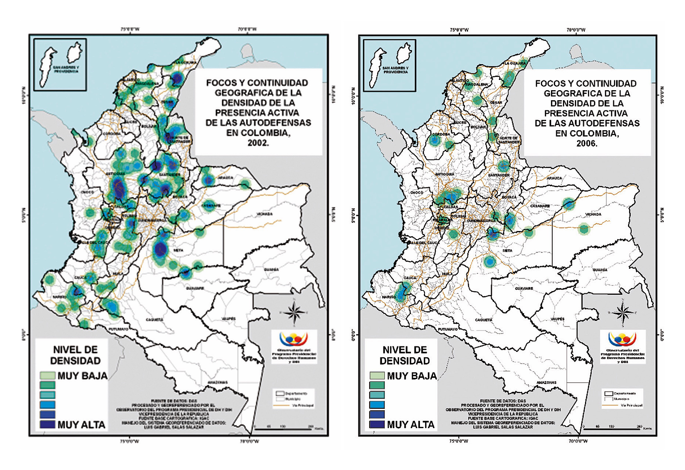 Al respecto, dentro de las diferentes posibilidades que un estudio espacial de la violencia permite en Colombia, parece necesario analizar una de las realidades menos profundizadas del conflicto armado interno: ¿qué sucedió cuando guerrillas y paramilitares coincidieron en tiempo y lugar? La falta de estudios geográficos al respecto ha tendido a atribuir, casi por automatismo, la victoria paramilitar en Colombia allí donde éste coincidió en espacio y tiempo con las guerrillas, de manera tal que la idea es tomar dos lugares de importante arraigo de FARC y ELN, como son el noreste colombiano, específicamente los departamentos de Arauca y Norte de Santander, y el suroeste, en torno a los departamentos de Valle del Cauca, Cauca, Nariño, Putumayo, Huila y Tolima, y observar si allí donde hubo coincidencia es plausible la afirmación de expulsión de las guerrillas por parte del paramilitarismo. El propósito último sería el de desmitificar esta atribución predominante en favor del paramilitarismo y comprobar la hipótesis de que el arraigo de las guerrillas colombianas se mantuvo inalterado en aquellos escenarios de mayor presencia, a pesar de la amenaza paramilitar.