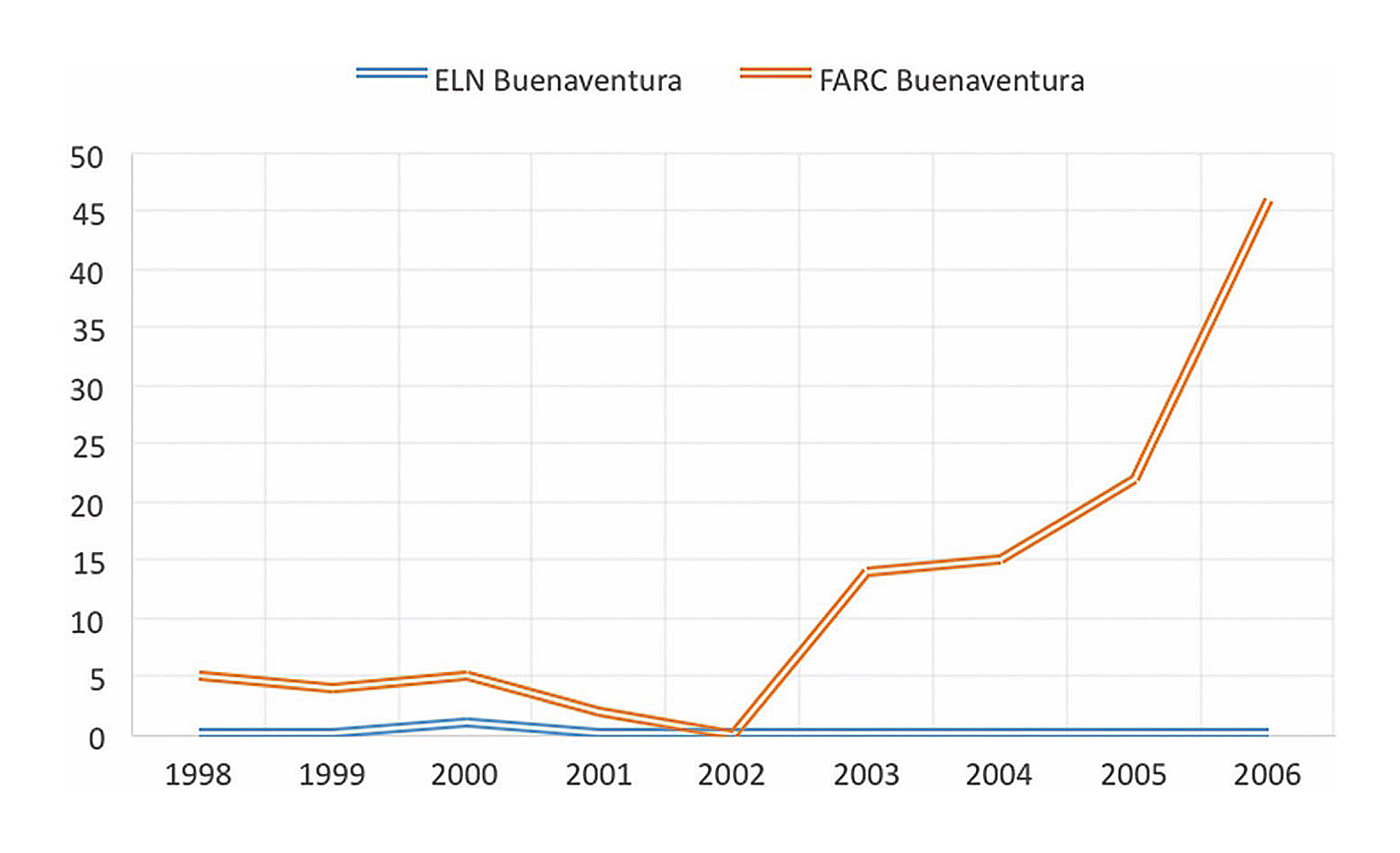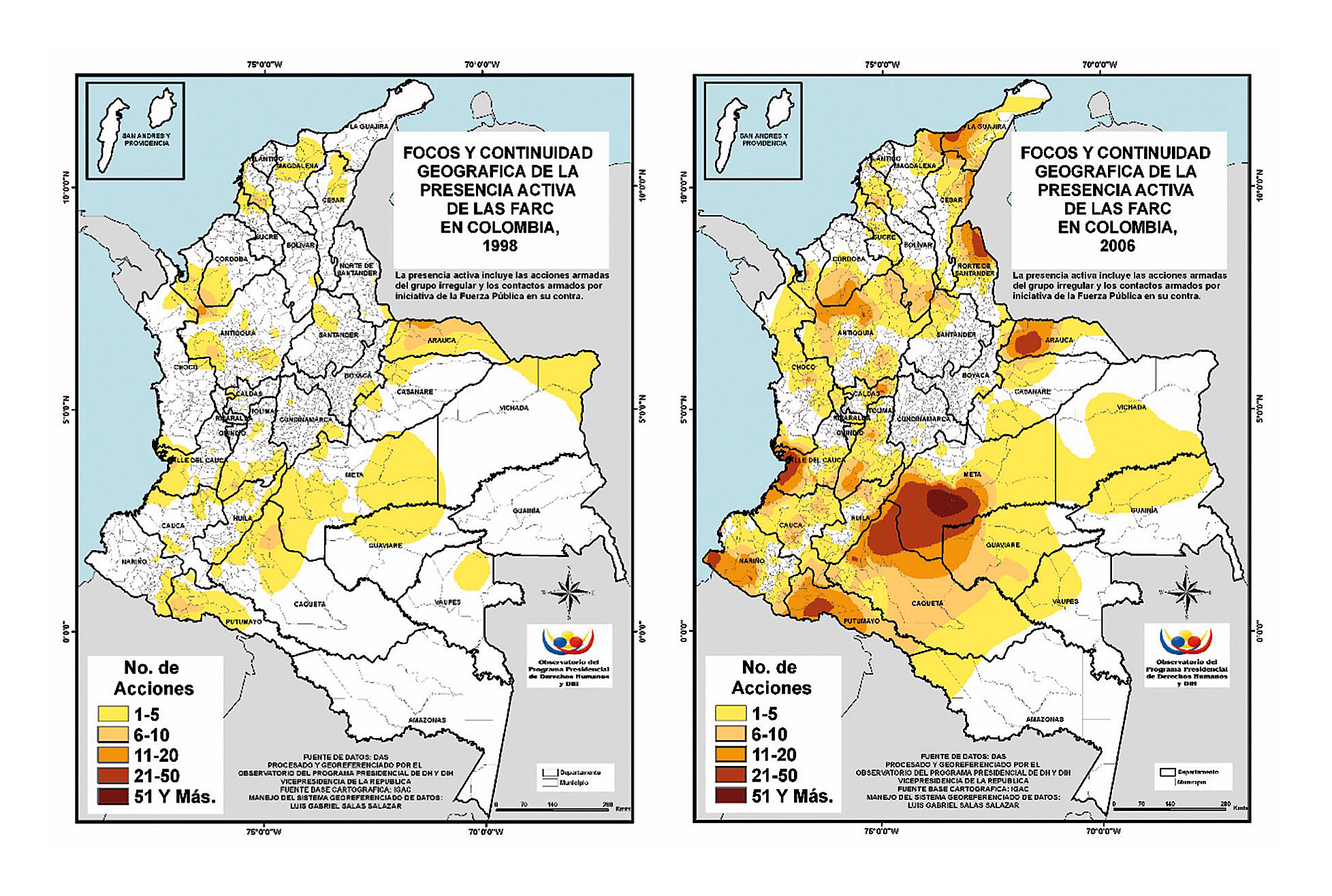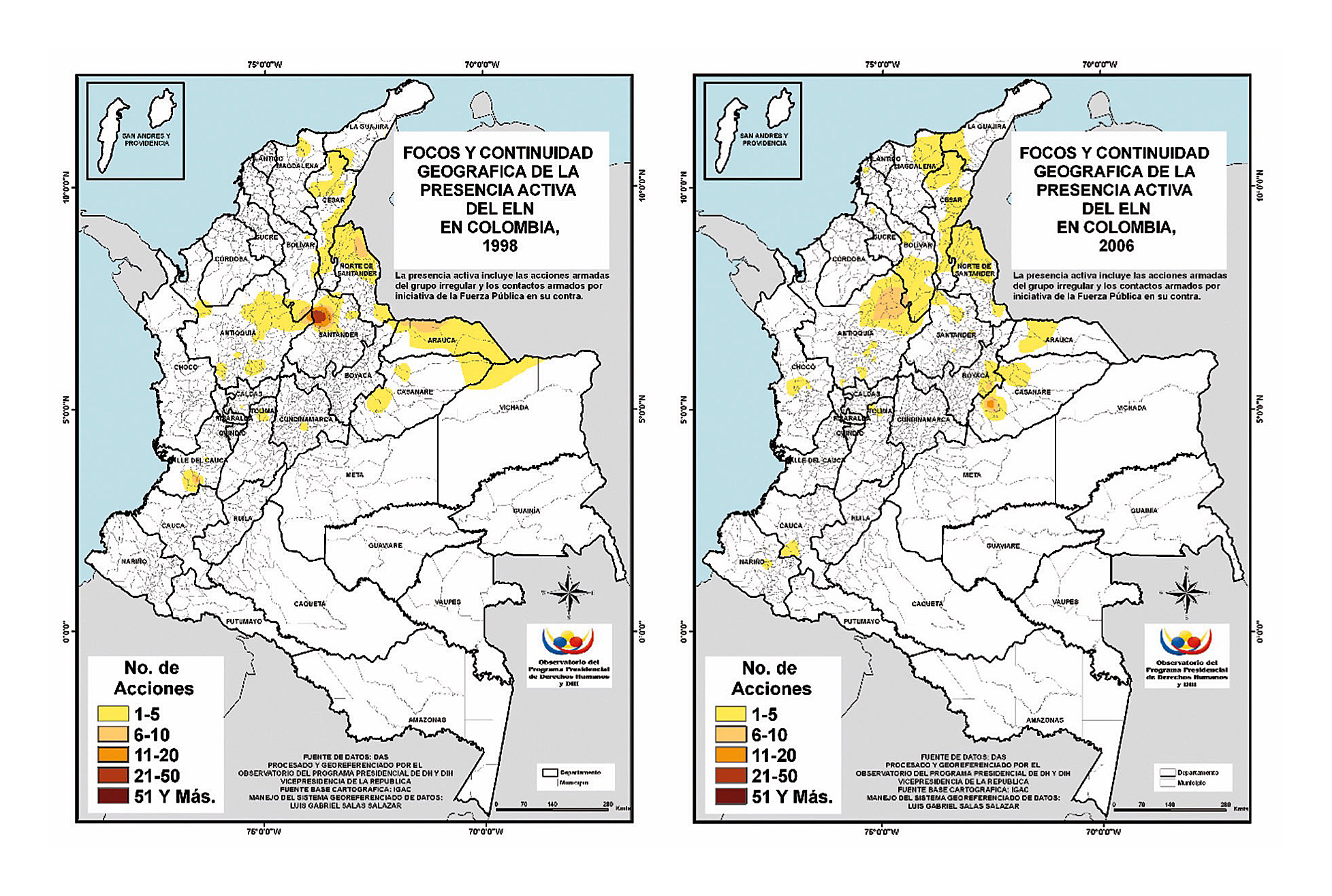 Basta con observar cómo, únicamente entre 1998 y 2002, esta guerrilla llegó a acumular hasta 165 acciones guerrilleras por solo veintisiete operativos de la Fuerza Pública. Lo mismo sucedía con las FARC, muy activas por la presencia de los frentes 10 y 45, que compartieron (y disputaron) la presencia territorial al ELN, si bien con un nivel de violencia mucho mayor, que asciende entre 1998 y 2002 hasta las trescientas siete acciones, y que hacen de las FARC el actor hegemónico local en términos de activismo armado, superando con mucho los 85 operativos militares puestos en marcha contra las FARC por parte de la fuerza pública en estos años (Observatorio de Derechos Humanos y Derecho Internacional Humanitario (ODHDIH). (s.f.) Síntesis de la violencia y la confrontación armada en Colombia, 1998-2012 y 2015. Bogotá: Vicepresidencia de la República.ODHDIH, s.f.).