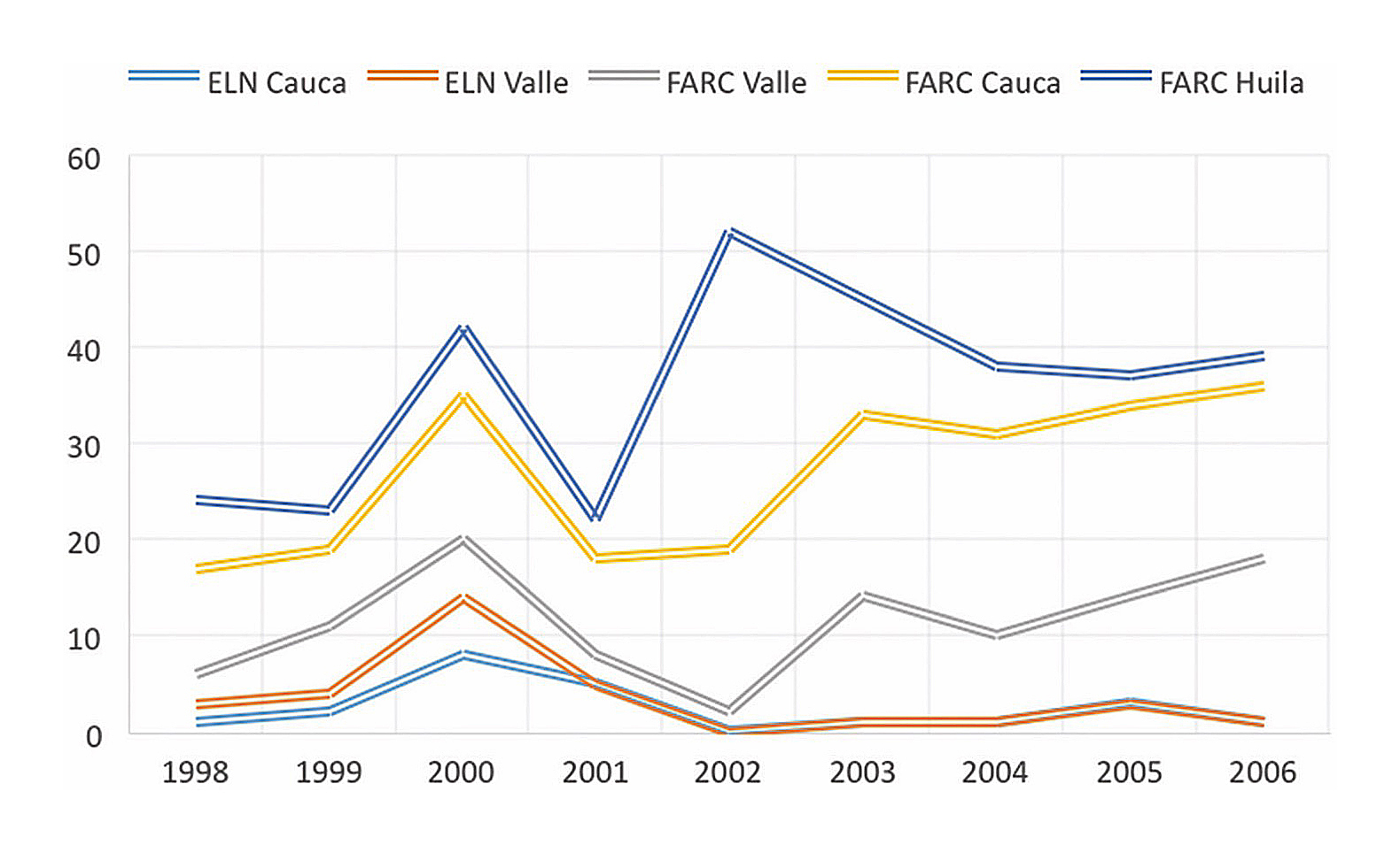 Entre 1998 y 2005, el ELN fue objeto de 73 acciones de la fuerza pública en Cauca, 48 en Nariño y cincuenta en Valle del Cauca. A su vez, las FARC sufrieron 374 acciones en Cauca, 253 en Nariño y 220 en Valle del Cauca, es decir, significativamente por debajo del activismo armado de las guerrillas (Observatorio de Derechos Humanos y Derecho Internacional Humanitario (ODHDIH). (s.f.) Síntesis de la violencia y la confrontación armada en Colombia, 1998-2012 y 2015. Bogotá: Vicepresidencia de la República.ODHDIH, s.f.). |