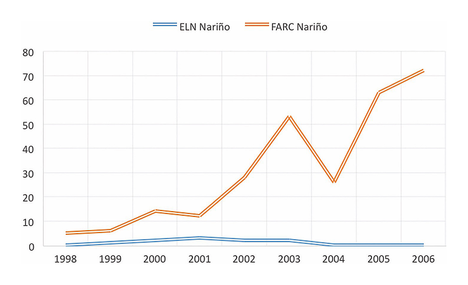 Desde 2010 y hasta 2012 el ELN, por ejemplo, protagoniza en Nariño hasta 36 acciones guerrilleras (Observatorio de Derechos Humanos y Derecho Internacional Humanitario (ODHDIH). (s.f.) Síntesis de la violencia y la confrontación armada en Colombia, 1998-2012 y 2015. Bogotá: Vicepresidencia de la República.ODHDIH, s.f.). |