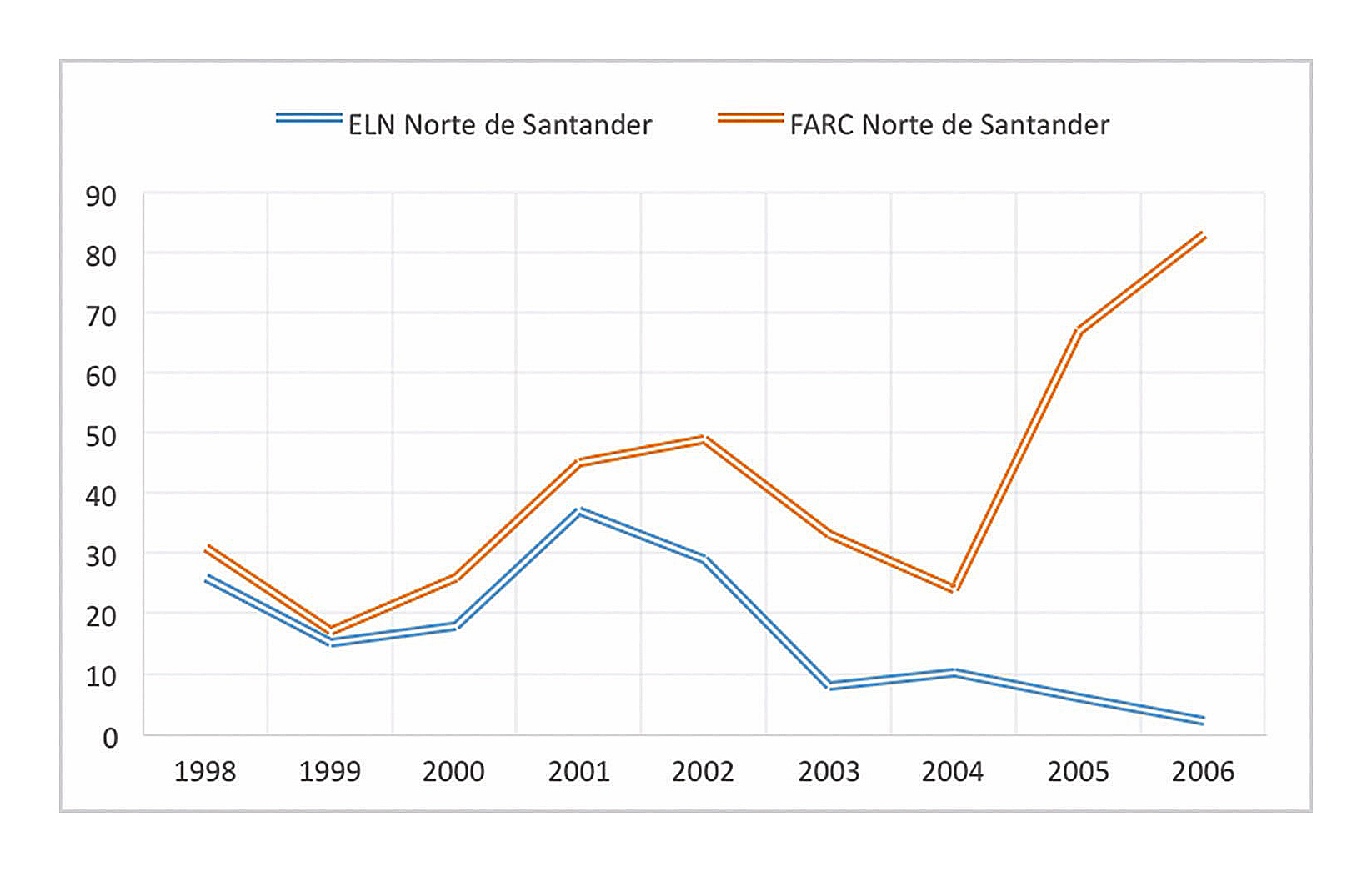 Con el ELN sucedió algo diferente, pues entre 1998 y 2002 actuó como el grupo armado más importante, acumulando hasta 133 acciones guerrilleras en buena parte de la totalidad del departamento, pero, especialmente, en contextos de coincidencia con las FARC y con el BCAT, tal y como fueron los casos de El Tarra, El Zulia, Cúcuta, Tibú y Sardinanta. Sin embargo, si hacia 2003 las FARC evidenciaban un proceso de fortalecimiento y protagonismo creciente, al contrario en el ELN las acciones decaen a mínimos históricos, con apenas una decena de acciones armadas, y en 2004 se llegó casi a la completa inacción. Esto fue consecuencia de un proceso de paulatino repliegue, a tenor del fuego cruzado con las FARC y el paramilitarismo, de manera que hubo que esperar casi hasta 2009 para su recomposición en el departamento y su nuevo marco de alianza con las FARC, vigente hasta 2015[14].