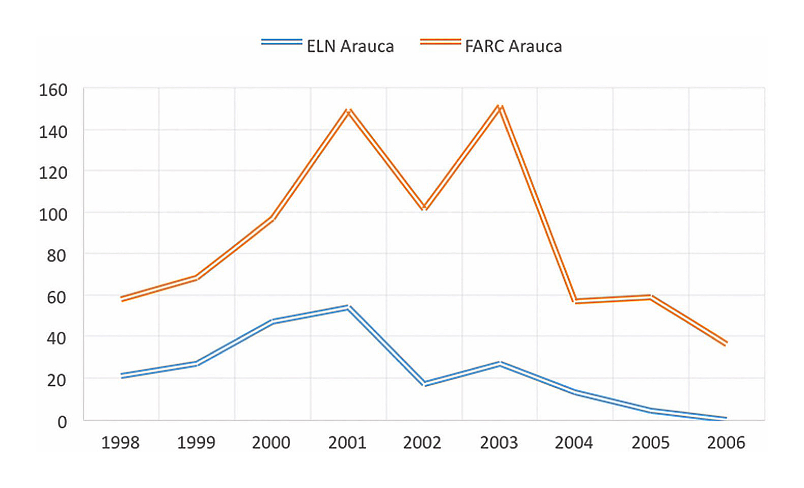 Por su parte, el ELN hacia Ríos, Jerónimo. 2016. «La periferialización del conflicto armado colombiano, 2002-2014», en Geopolítica(s). Revista sobre Estudios de Espacio y Poder, 7 (2): 251-275.2005 prácticamente se había replegado en el departamento, en un proceso similar al de Norte de Santander, fruto de la confrontación directa que hasta ese entonces habían mantenido con las FARC. Así, basta con observar cómo aquel año el ELN apenas protagonizó cuatro acciones armadas –Arauca (2), Arauquita (1), Saravena (1)–, lo cual supone una cifra muy alejada de las 54 acciones del año 2001 o incluso de las 27 acciones de 2003. No obstante, nunca desparecerá por completo del departamento y una vez sellada la pax guerrillera con las FARC en 2009, se recompondrá paulatinamente, hasta convertir nuevamente Arauca como su centro nuclear de activismo y presencia territorial, tal y como sucede hoy en día con motivo del más que notable protagonismo que el Frente de Guerra Oriental mantiene en el departamento.