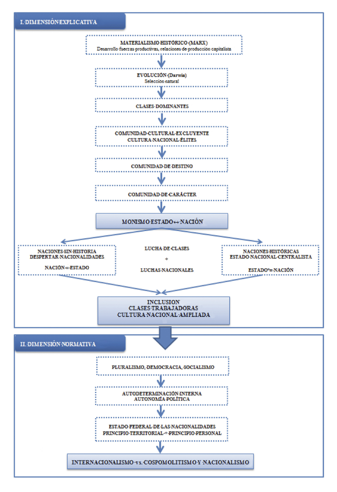 Es preciso resaltar, desde el comienzo, esta original perspectiva en el contexto de la época (Haupt, George, Michel Lowy y Claudie Weill. 1974. Les marxistes et la question nationale 1848-1914. París: Maspero.Haupt et al., 1974: 47), la doble dimensión de su teoría no reduccionista de la nación (empírica e normativa: véase esquema 1), para dar cuenta cabal de una aportación que se distancia no ya de la huera palabrería metafísica del Volksgeist, sino de la historiografía positivista del nacionalismo, abocada a la febril procura de antecedentes (históricos, lingüísticos, antropológicos) de la nación. Un análisis que también brilla con luz propia frente a la entera tradición socialista y comunista, plagada de reduccionismo e instrumentalismo, y que destaca incluso frente autores austromarxistas como Renner, con quien el autor posee, como veremos, innegables desacuerdos (Nagel, Klaus (ed.). 2016. Otto Bauer, Karl Renner. Escrits sobre nació i federalisme. Barcelona: IEA.Nagel, 2016: 17) y multitud de deudas (la introducción del principio no territorial de personalidad, por ejemplo) (Arzoz Santisteban, Xabier. 2015. «Karl Renner y la teoría de la autonomía nacional», en Karl Renner, Estado y Nación. El derecho de las naciones a la autodeterminación. Madrid: Tecnos.Arzoz, 2015: LXXX).