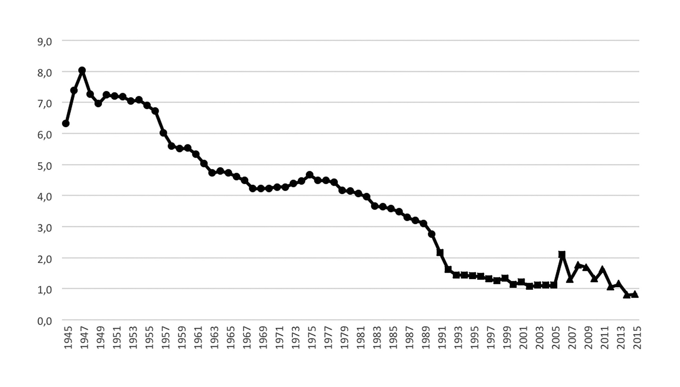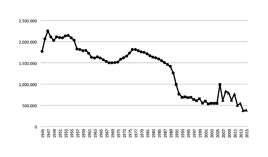 Membership of the Italian Communist Party (PCI, 1945-1990), the Democratic Party of the Left or Left Democrats (1991-2006), the Democratic Party (2007-2015) as percentage of the national electorate