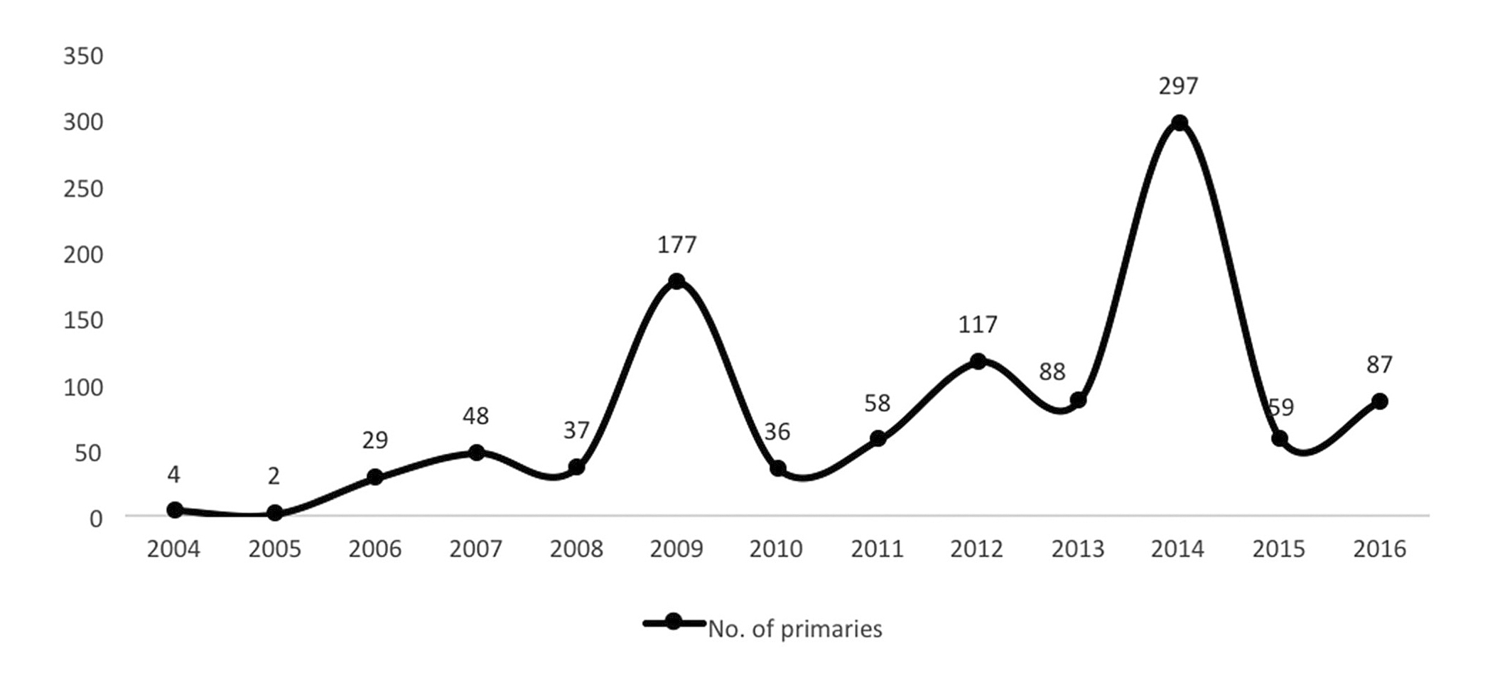 have reached the quite impressive number of 1.039 at the municipal level (Seddone, Antonella and Marco Valbruzzi. 2012. Primarie per il sindaco. Partiti, candidati, elettori. Milano: Egea.Seddone and Valbruzzi, 2012; Venturino, Fulvio. 2016. “Primarie comunali: mal comune senza gaudio?”, inn Marco