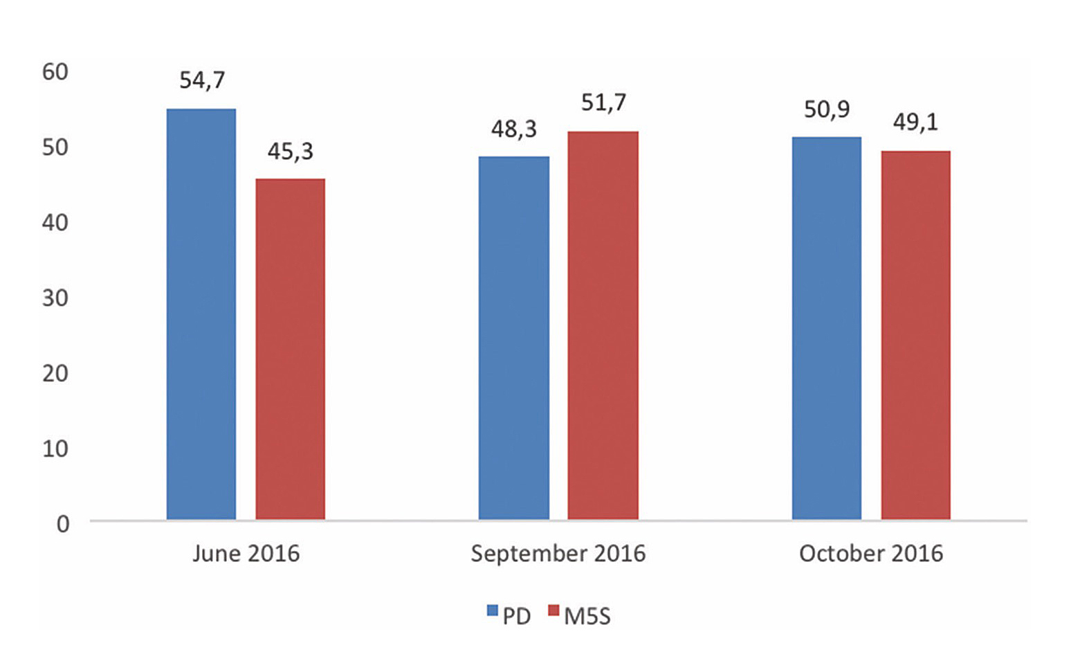 Voting intentions in the hypothetical run-off election between Democratic Party (PD) and Five Star Movement (M5S), 2016 (percentage values)
