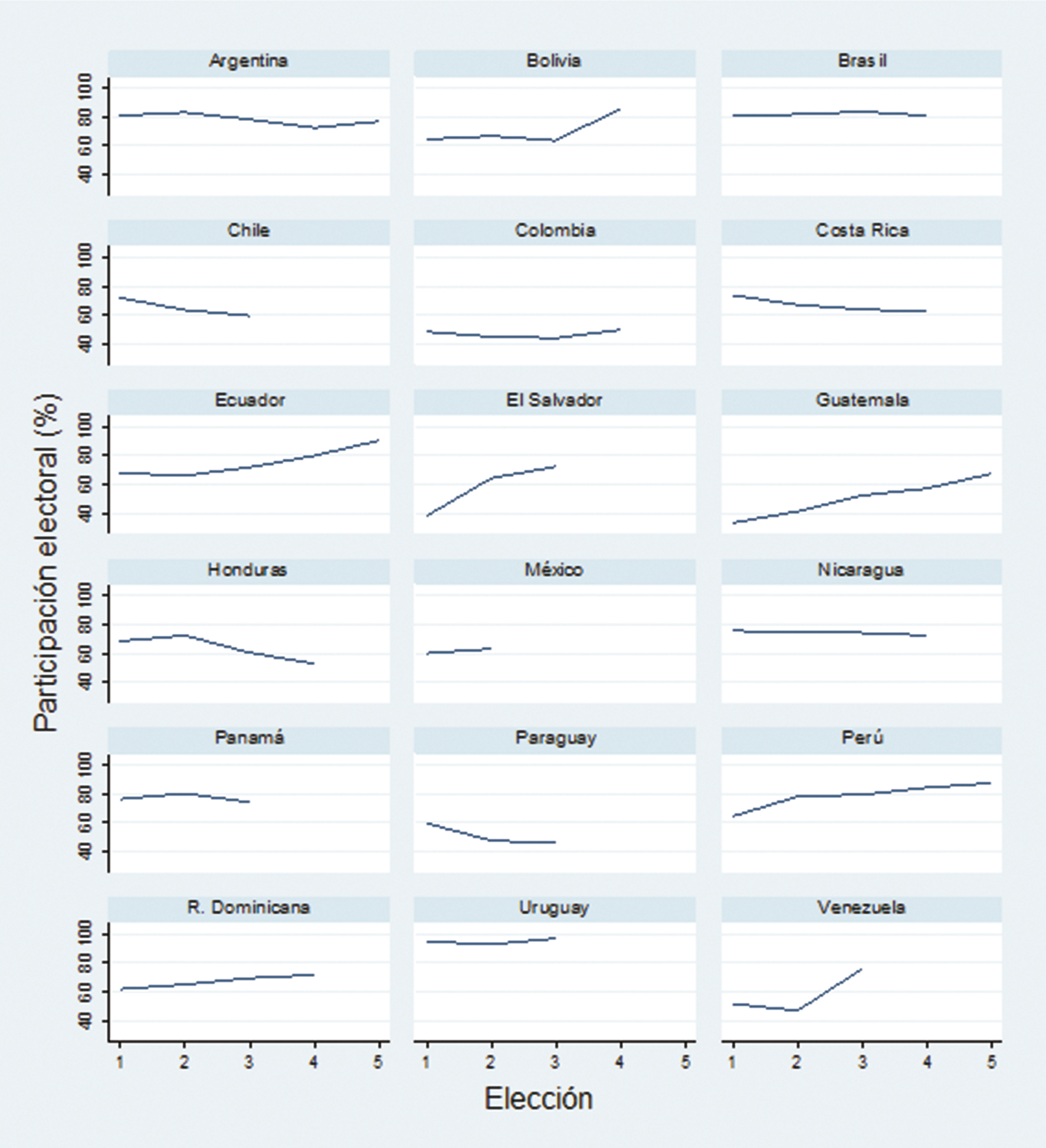 Los porcentajes de participación electoral se obtuvieron principalmente de los organismos electorales de cada país así como de las bases de datos disponibles en International IDEA (https://www.idea.int/) y Political Database of the Americas (http://pdba.georgetown.edu/). |
