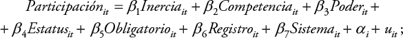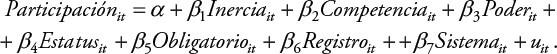 Competencia electoral se mide como la diferencia en puntos porcentuales entre el primer y el segundo candidato con más votos en la primera vuelta. El poder presidencial institucional consiste en el índice elaborado por García ( García, Mercedes. 2009. Presidentes y Parlamentos: ¿quién controla la actividad legislativa en América Latina? Madrid: Centro de Investigaciones Sociológicas.2009), el cual oscila entre 0 (menor poder) y 1 (mayor poder). El estatus mayoritario corresponde al total de votos obtenido en la Cámara Baja por el partido (o coalición) del candidato presidencial ganador de la primera vuelta. El voto obligatorio se codifica con 0 si el voto no es obligatorio, 0.5 si es obligatorio sin sanciones y 1 si es obligatorio con sanciones. El modo de registro electoral asume el valor 0 si es obligatorio o voluntario y 1 si es automático. El sistema de elección presidencial indica 0 si el presidente se elije por mayoría simple y 1 por mayoría absoluta o con umbral reducido. Para mayor información sobre las variables y las fuentes, consúltese Pignataro ( Pignataro, Adrián. 2014a. «Participación electoral comparada en América Latina: un modelo desde la teoría de elección racional», Revista Derecho Electoral, 17: 154-184.2014a). |