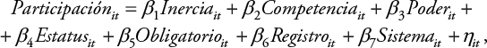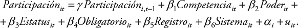 Adviértase que en los primeros tres modelos el número de observaciones desciende a 50 ya que el cálculo de la participación previa implica la pérdida de observaciones en la primera elección (t = 1). En el caso del estimador Arellano-Bond se pierde el doble de observaciones porque utiliza un mínimo de dos rezagos como instrumento, disminuyendo a 32. |