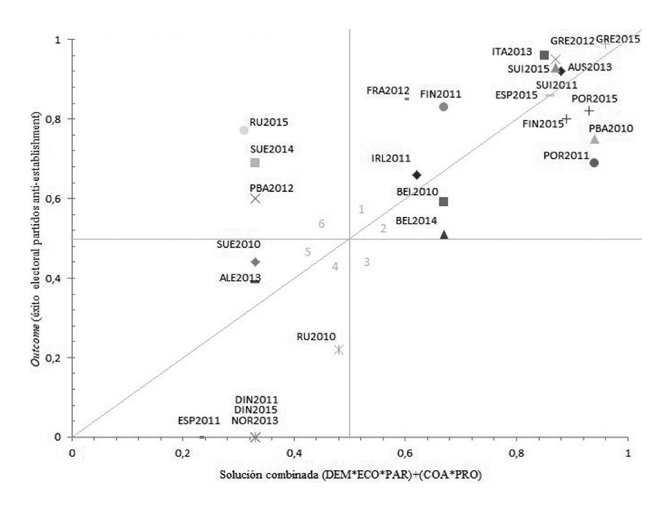 Consistencia: 0.869; Cobertura: 0.874; Correlación R de Pearson: 0.77**. DEM: altos niveles de insatisfacción con el funcionamiento de la democracia; PAR: altos niveles de desconfianza en partidos y políticos; ECO: altos niveles de insatisfacción con el estado de la economía; COA: coaligence: coaliciones y convergencia; PRO: sistemas electorales proporcionales. Restos lógicos: para la solución intermedia se ha considerado que las cinco condiciones causales debían estar presentes. Solución parsimoniosa: DEM+COA; solución compleja: COA*PRO*~ECO*~DEM* ECO*PAR*DEM.
