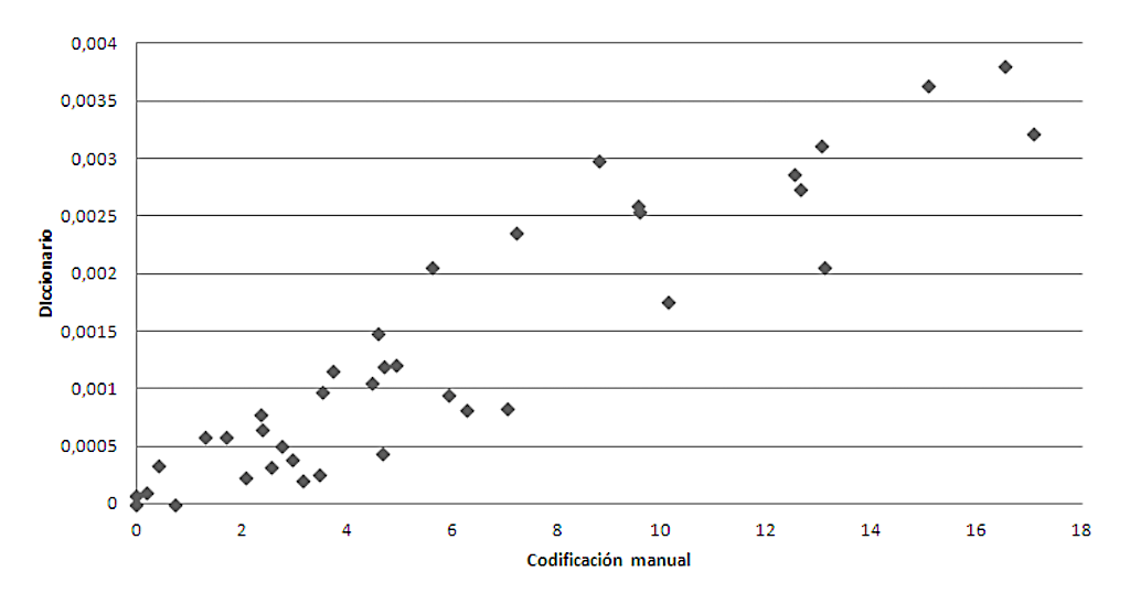Finalmente, hemos validado nuestra codificación manual mediante la comparación de nuestros resultados con los obtenidos de aplicar un diccionario de palabras (otra de las técnicas del análisis de contenido) a los mismos textos que hemos codificado de manera manual. Como puede verse en el gráfico A1, la correlación es casi perfecta (R=0,93, N=38) entre los resultados de ambos tipos de técnicas; lo que nos indica que nuestra codificación manual se ha realizado de manera correcta y que los resultados que hemos obtenido reflejan efectivamente el porcentaje de tiempo de dedicado al terrorismo en cada discurso.