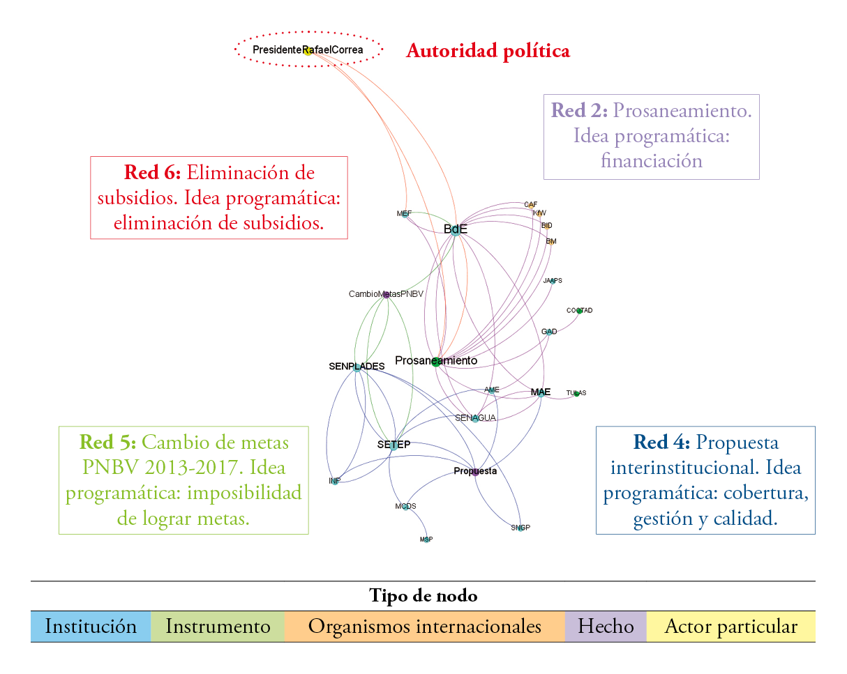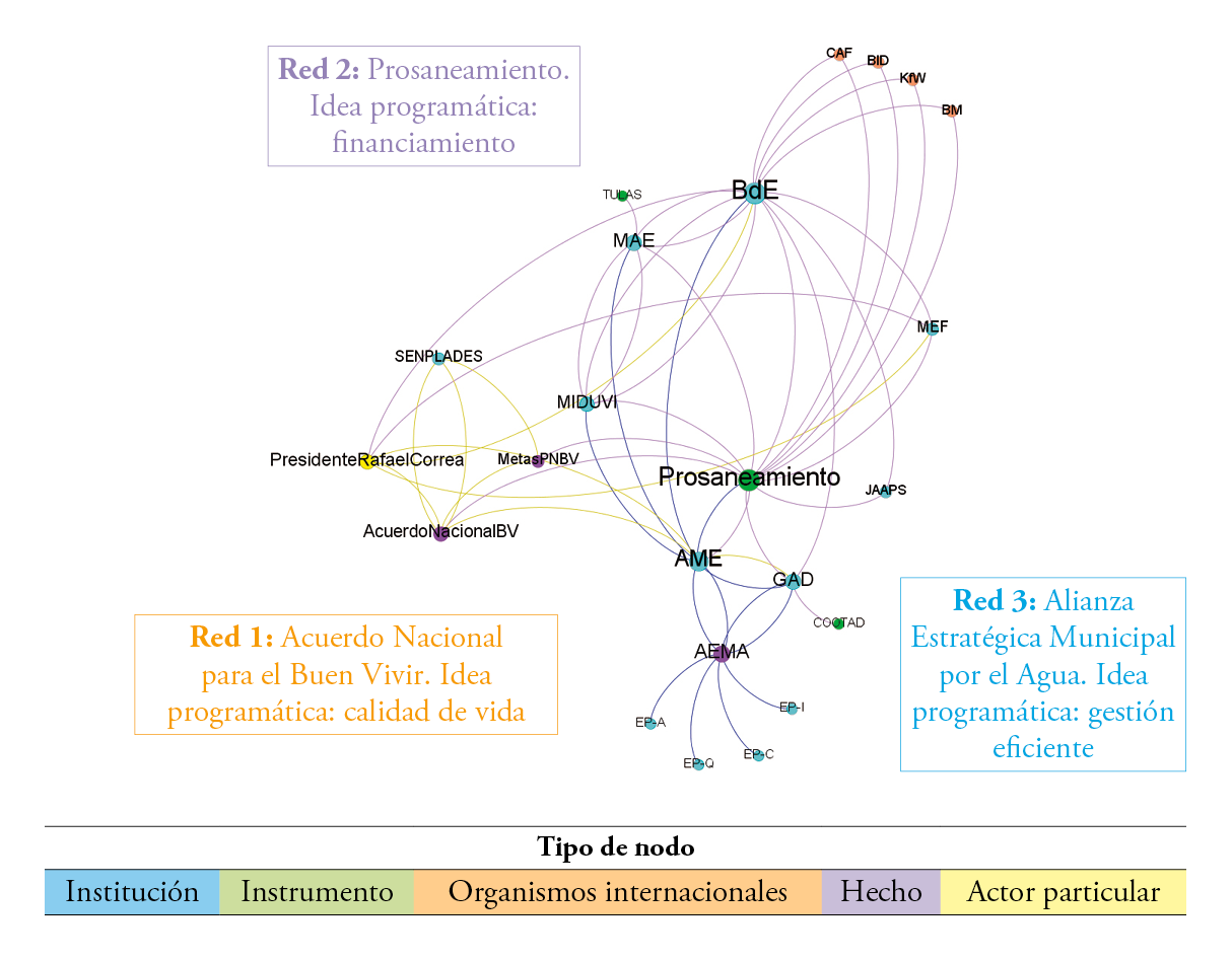 Este panorama influyó para que en el año 2012 se conformara la red de política Acuerdo Nacional para el Buen Vivir, donde el presidente y la Asociación de Municipalidades del Ecuador (AME), en representación de los GAD, se comprometieron a trabajar en conjunto. La idea programática de la red constituida dentro del acuerdo nacional es la «calidad de vida» de los beneficiarios. Los propios alcaldes piden «insertarse en temas de mayor perspectiva nacional, demanda que se articula con la oferta del presidente de trabajar en obras que mejoren la calidad de vida de la población» ( Entrevista con actor clave de la Asociación de Municipalidades del Ecuador (EACA). 2016. Entrevista realizada a María Fernanda Maldonado, exdirectora ejecutiva. Entrevista realizada el 25 de febrero de 2016.EACA, 2016). De esta forma se propone la meta de alcanzar una cobertura de 95 % de estos servicios hasta el 2017. Esta meta es incorporada en el Plan Nacional de Desarrollo (Plan Nacional del Buen Vivir), donde se incluye como una de sus políticas el garantizar el acceso universal a estos servicios. Los acuerdos que surgen en esta primera red fortalecen el contexto ideacional de la política, al incluir al agua y saneamiento dentro de la planificación nacional con carácter obligatorio.