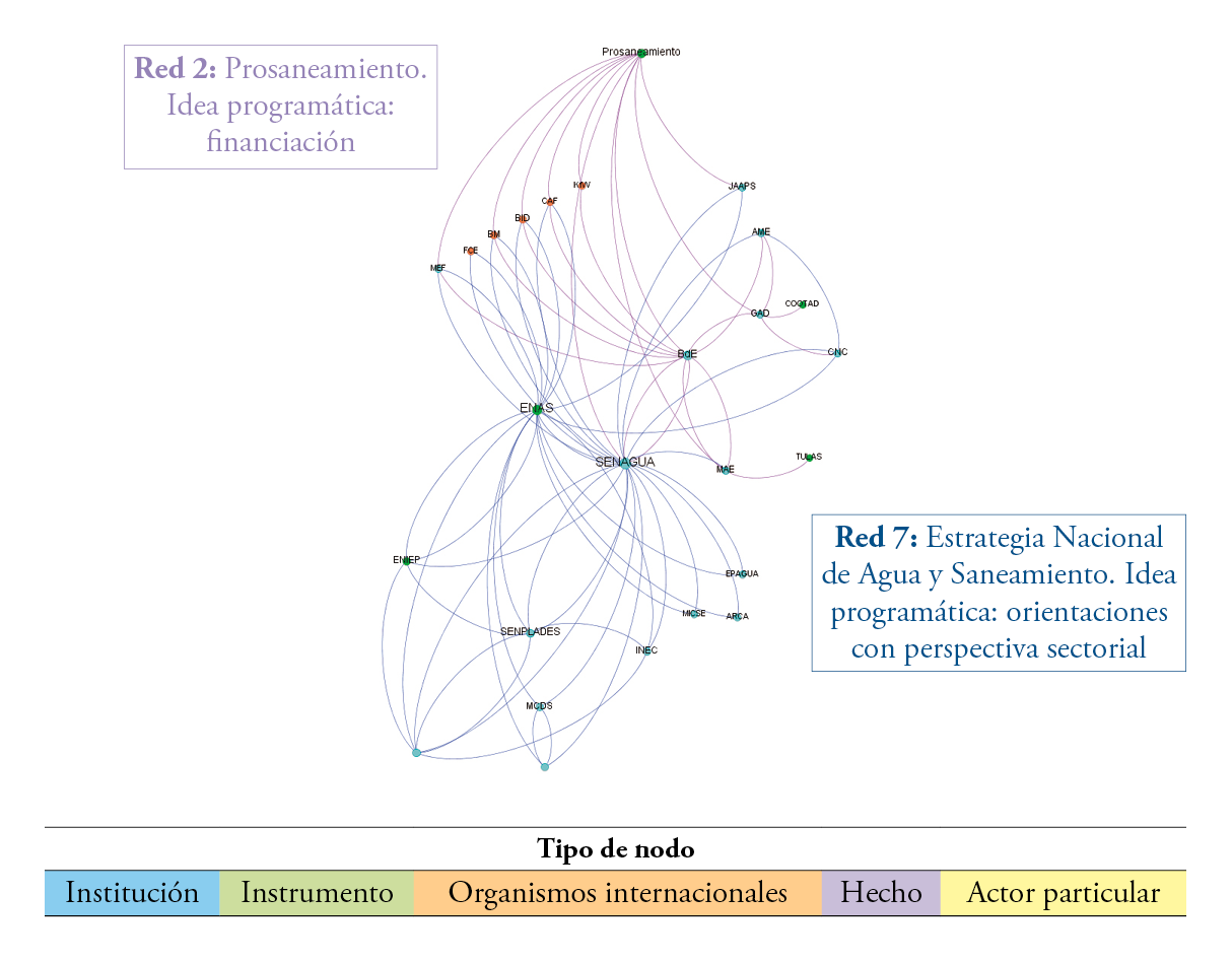 A través de estas técnicas, se ha rastreado a los actores en función de la referenciación de unos con otros y de la intensidad de sus relaciones. Cada una de estas relaciones fue asentada y codificada en una base de datos con el fin de mostrar gráficamente la red. Un primer registro se dedicó a los nodos y su tipología: instituciones, instrumentos, hechos, actores particulares, organismos internacionales. Un segundo registro se estableció entre los actores y las ideas programáticas que los cohesionan en redes de política. El resultado de ambos registros se exportó al programa de análisis de redes sociales Gephi 0.82, con el fin de representar mediante una figura la red y de minimizar errores en la información digitalizada.