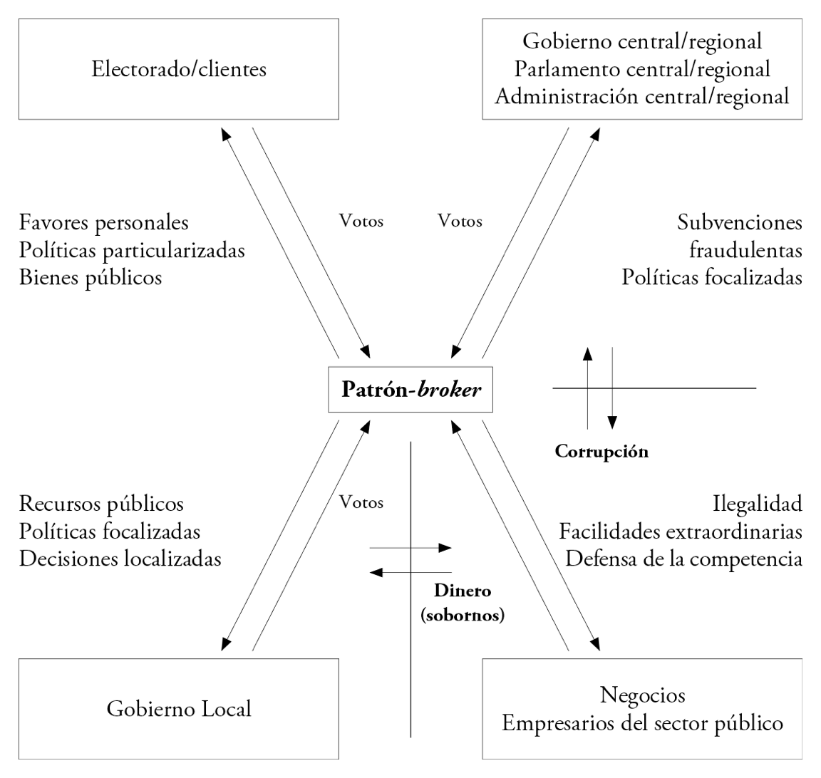 A diferencia del clientelismo clásico, el nuevo sistema corrupto-clientelar se distancia de una institución bajo cuyo paraguas se producían todas las contrataciones para evolucionar hacia una abigarrada y opaca red de organizaciones privadas proveedoras de servicios al sector público, que dificultan la investigación y observación del fenómeno. La nueva relación clientelar introduce la figura del empresario de lo público, un pacto horizontal entre iguales (patrón-empresario) que lo sitúa en el clientelismo corrupto y conceptualmente lo aleja del clientelismo vertical entre subordinados, propio de las relaciones patrón-cliente. En la práctica, se solapan las redes corruptas horizontales con las tradicionales redes clientelares jerárquicas.