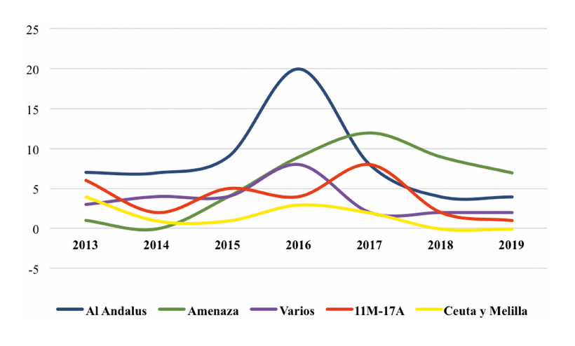 Fuente: elaboración propia a partir de los datos del Observatorio sobre Referencias a España en la Propaganda Yihadista del Grupo de Estudios en Seguridad Internacional (GESI) compiladas por el autor.