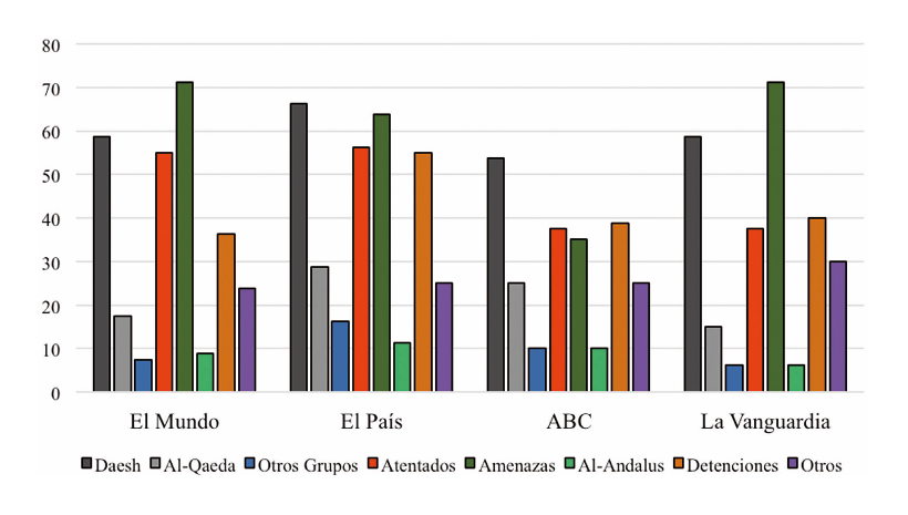 Finalmente, se han recogido también otras piezas editoriales que, aunque forman parte de nuestra muestra, no aportan datos relevantes para esta investigación. Dichas piezas editoriales se enmarcan dentro de entrevistas a expertos de instituciones del Ministerio de Defensa, como el Instituto Español de Estudios Estratégicos, reseñas históricas sobre la actividad yihadista en España o implicaciones políticas de las políticas de seguridad y defensa, entre otros temas. Como se puede apreciar, estas temáticas se encuentran presentes en todos los medios en porcentajes que oscilan entre el 23,75 % y el 30 %.