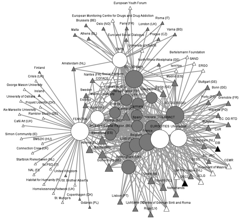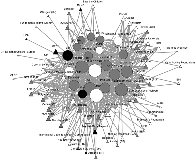 En este apartado, exponemos los resultados de nuestro análisis empírico sobre la politización en los procesos de definición de la Agenda Urbana para la UE, entendida como un aumento de la presión de coaliciones de actores políticos y de la controversia. Los grafos representan las redes generadas alrededor de las coaliciones de estudio. Los nodos circulares representan los actores que integran la coalición y los nodos triangulares los actores que han participado en eventos junto a los actores que integran la coalición. Los nodos grises representan las entidades políticas, los nodos blancos representan los agentes con un interés difuso y los nodos negros representan los agentes con un interés específico. El área del nodo es proporcional al número de enlaces de cada actor (grado).