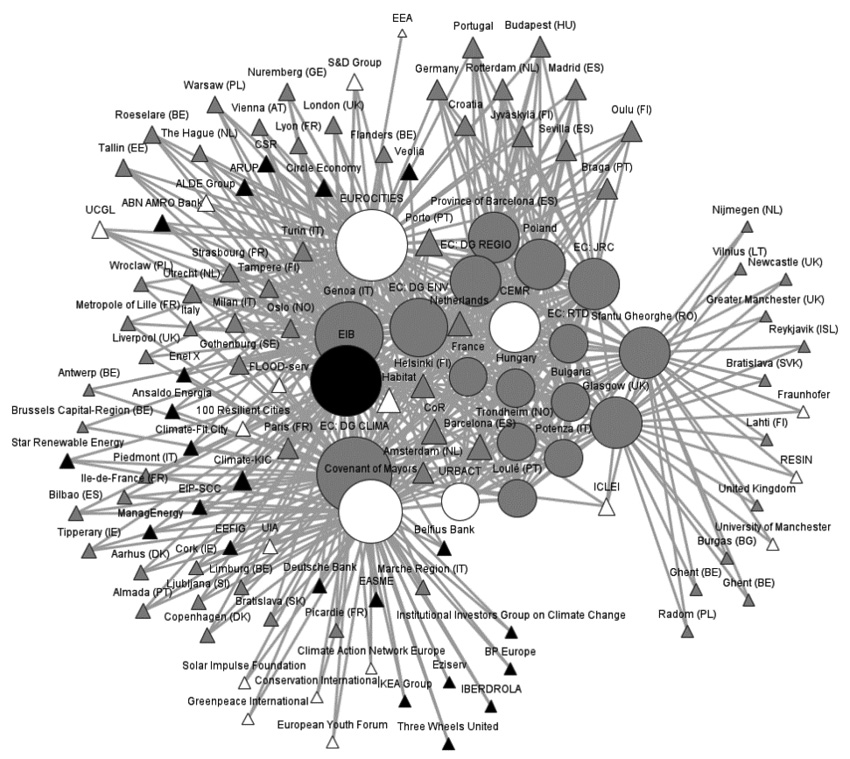 Entre los actores integrantes de la coalición más relevantes encontramos dos asociaciones de entidades locales (EUROCITIES y Pacto de los Alcaldes), una entidad europea (Dirección General de Acción por el Clima), una institución económica europea (Banco Europeo de Inversiones) y la entidad local de Génova. Si bien entre los actores integrantes de la coalición más relevantes no encontramos ninguna autoridad local, entre los actores externos encontramos a las ciudades de Oporto y Barcelona. De este modo, las entidades locales se posicionan como los actores centrales de la red. Por el contrario, los agentes sociales no son ni numerosos ni centrales en la red.