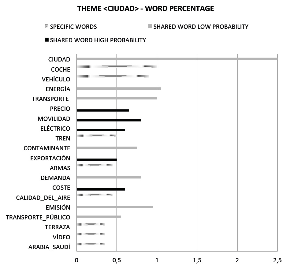 La segunda temática emergente es ciudad, que representa la dimensión local de la pandemia (ver figura 3). Las palabras con mayor probabilidad de ocurrencia son movilidad, eléctrico y precio, junto a palabras específicas como coche, vehículo, tren o calidad del aire. El cierre forzoso de todas las actividades y el confinamiento de las personas de un día para otro hacía evidente que se pueden tomar medidas más directas para reducir las emisiones de CO₂ en las ciudades, impulsando el uso de otras formas de transporte. Por ejemplo, en una noticia de mayo de 2020 titulada «Cinco formas de REinventar una ciudad mejor», en relación con la pandemia Greenpeace publicó: