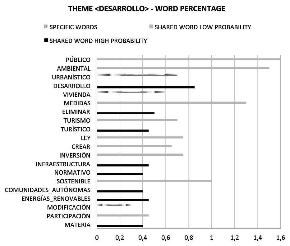 El tercer tema emergente es el desarrollo. Las palabras con mayor probabilidad de relación con esta temática son aquellas que hacen referencia a diferentes sectores económicos como el turismo, las infraestructuras, las energías renovables o con vivienda y urbanístico (ver figura 4). Se destaca también la aparición de palabras relacionadas con actores políticos (comunidades autónomas) y con la regulación (normativa). En conjunto, al hablar de desarrollo el G5 apunta a sectores económicos que pueden tener una gran incidencia en la reducción de gases de efecto invernadero como el suministro de energía o la producción industrial (construcción e infraestructuras entre otros). En una noticia de junio de 2020, Amigos de la Tierra señala: