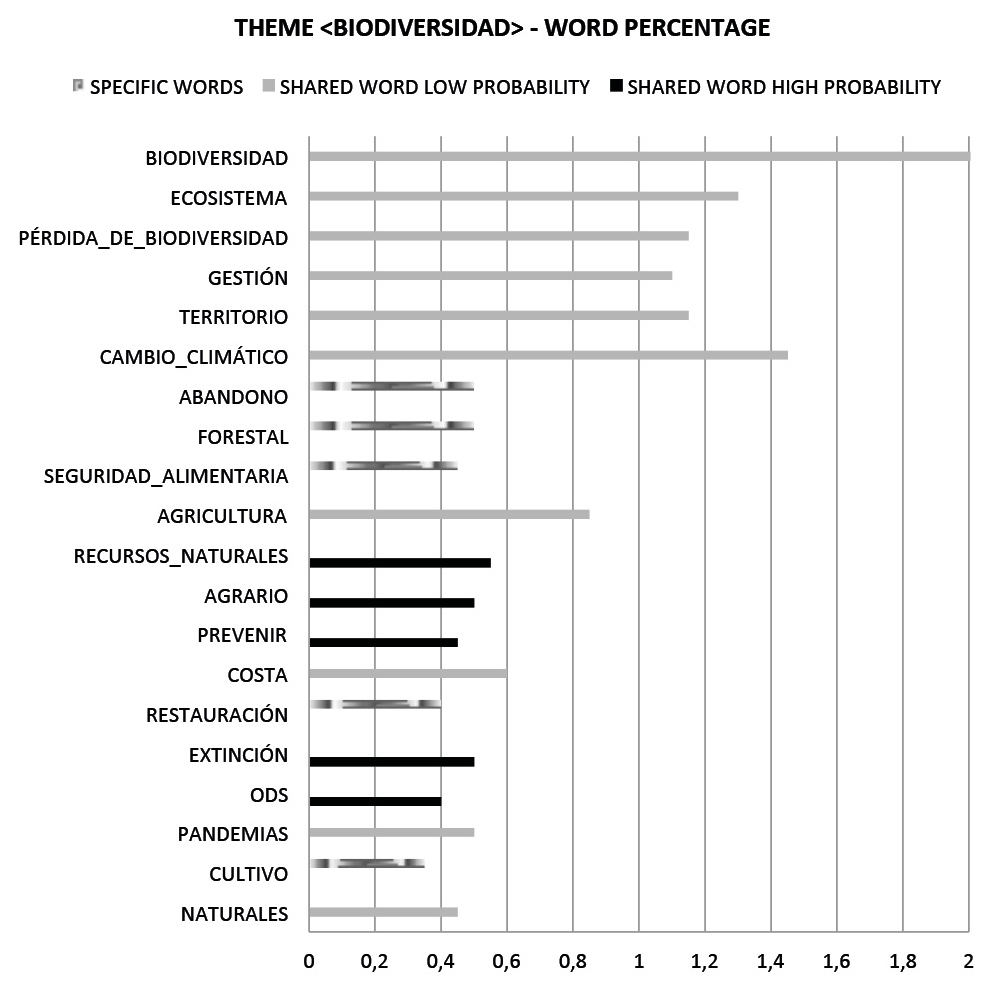 La última temática emergente es la biodiversidad, una de las preocupaciones clave de las ONG ecologistas, pues todas comparten como principio fundamental la protección de la biodiversidad. Las palabras claves con mayor probabilidad de aparecer son por este orden: recursos naturales, agrario, extinción prevenir y objetivos de desarrollo sostenible (ODS). Entre las palabras específicas relacionadas con la biodiversidad se encuentran términos como forestal, cultivo y seguridad alimentaria. Otras palabras asociadas con menor probabilidad de coincidencia son cambio climático, ecosistema o costa. En relación con las acciones, se observa un enmarcamiento que enfatiza el peligro (abandono y extinción) y pone el acento en sectores como la agroalimentación o el sector forestal (ver figura 6).