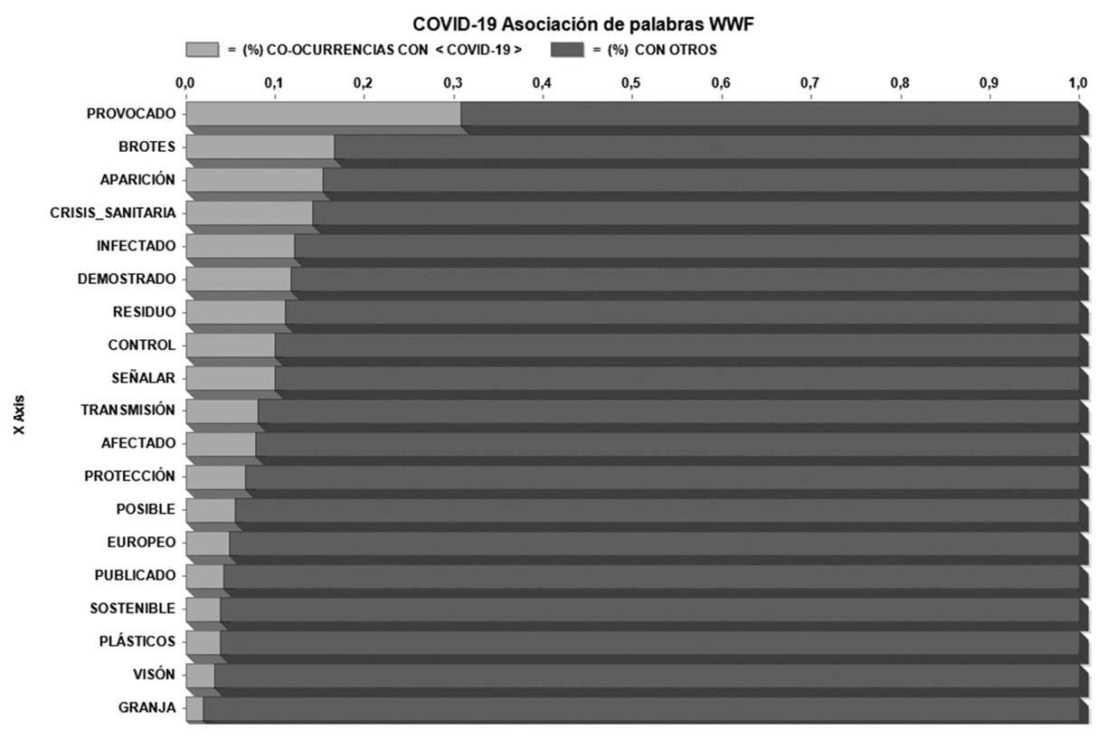 En las noticias de WWFEspaña hay una mayor co-ocurrencia con palabras asociadas directamente con la pandemia como crisis sanitaria o brotes, aparición, infectado, control, transmisión y protección (ver figura 8). No se observa una asociación importante con reivindicaciones o enmarcamientos políticos. En cambio, sí se muestra una propensión a relacionar la COVID-19 con residuos, plástico y sostenible. Destaca la atención prestada a las granjas y al visón. Además, una proporción significativa de las noticias de esta ONG protectora de las especies animales se centra en los contagios masivos y en el cierre de granjas de visón americano en toda Europa, así como a la denuncia de casos en España. En una noticia de diciembre de 2020, por ejemplo, señalaba: