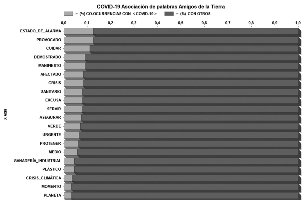 Finalmente, la ONG Amigos de la Tierra muestra la menor proporción de co-ocurrencia con la palabra COVID-19. La primera palabra con la que muestra una asociación es estado de alarma, y no pandemia, enfermedad o crisis, lo que podría indicar una preferencia por enmarcar los problemas con argumentos políticos (ver figura 11). En el mismo sentido irían las co-ocurrencias con palabras de acción como cuidar y proteger, o términos como urgente, excusa y manifiesto que implica una acción de movilización política. Otros temas asociados se relacionan con sectores que tienen una incidencia en el cambio climático como plástico o ganadería industrial. Junto con SEOBirdlife, esta ONG asocia la pandemia a la crisis climática. Otras palabras relacionadas con este tema serían verde, proteger y planeta.