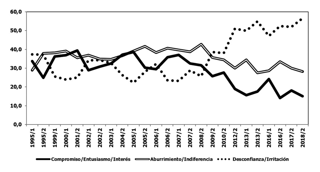 Uno de esos indicadores generales poco estudiados para conocer la dimensión afectiva de la comunidad política vasca es la pregunta sobre el sentimiento que los individuos tienen hacia la política. En el gráfico 1 podemos observar la evolución de esta cuestión en el País Vasco desde 1995 hasta 2019.