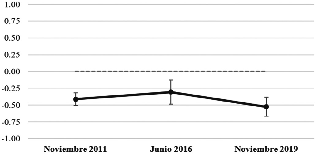 | Situación económica y política de España regular | -0.068 [0.063] | 0.113 [0.086] | -0.079 [0.114] |